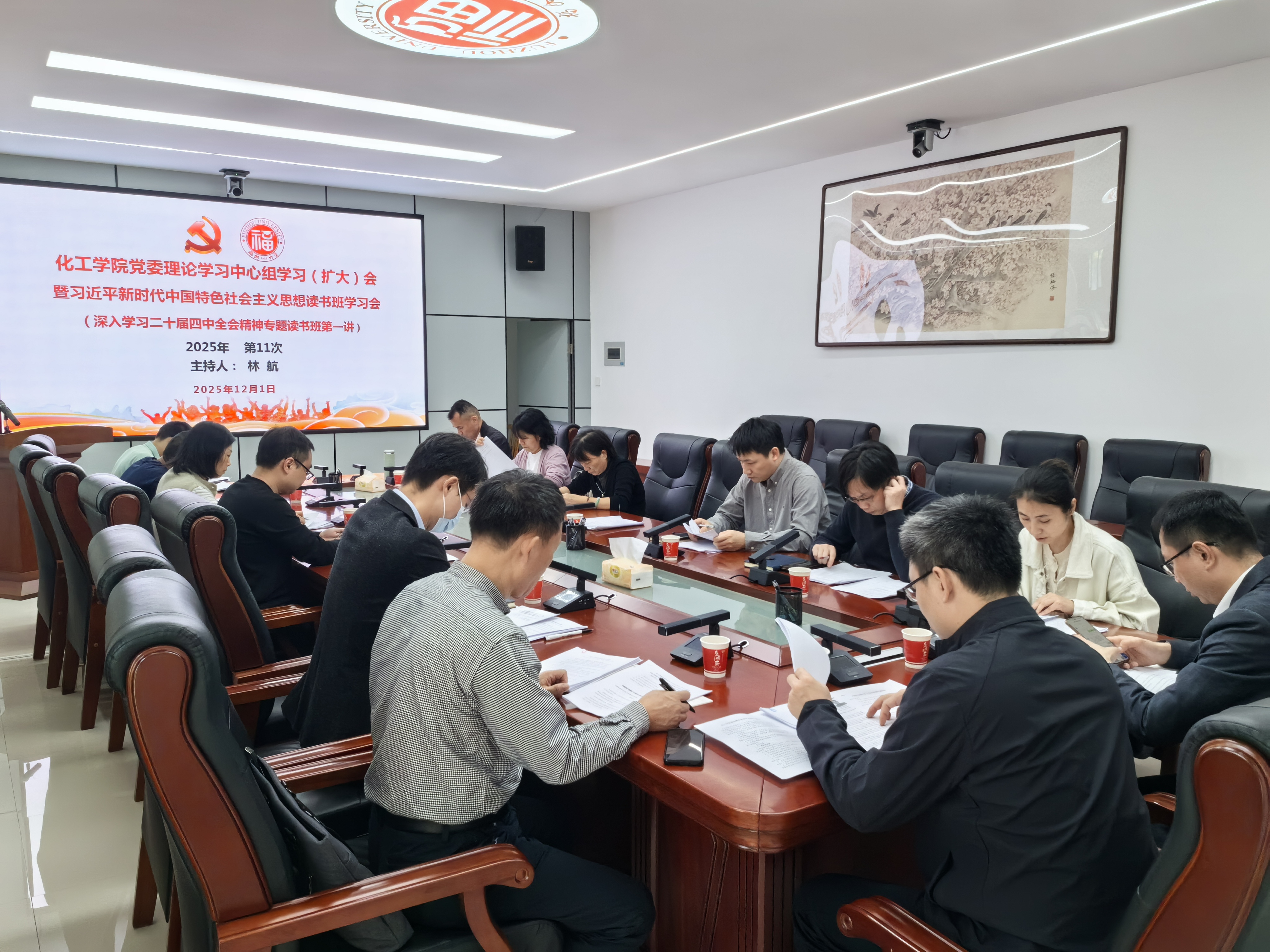 融媒中心讯/12月1日下午,化工学院党委理论学习中心组举行学习贯彻党的二十届四中全会精神读书班开班暨第一讲学习会,学院党委班子成员、科级以上干部参加会议。学院党委书记林航主持会议。