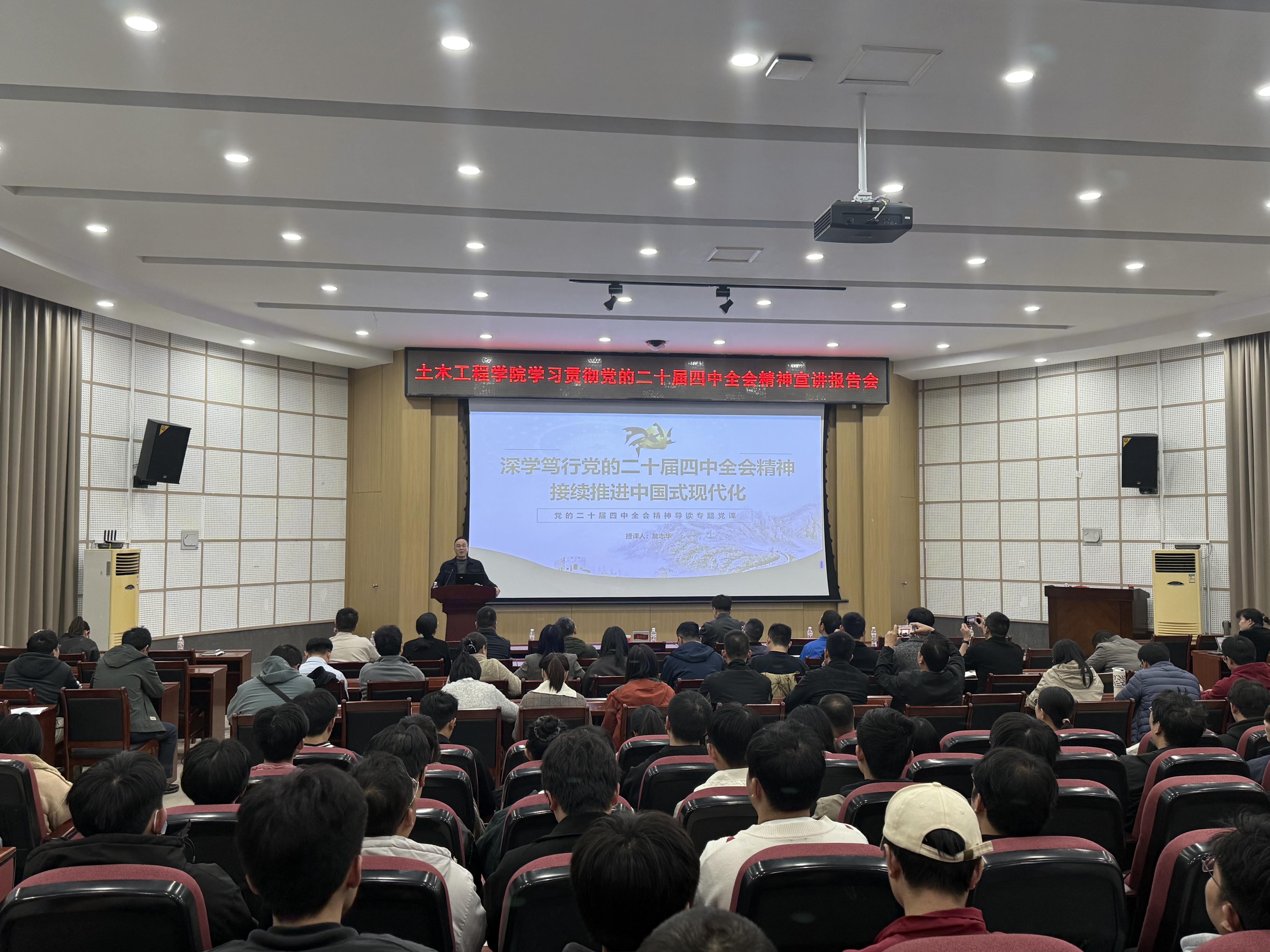 融媒中心讯/为深入学习宣传贯彻党的二十届四中全会精神,切实把全院师生员工的思想和行动统一到党中央决策部署上来,12月18日,土木工程学院举办学习贯彻党的二十届四中全会精神宣讲报告会暨党务干部培训会。马克思主义学院院长詹志华教授担任主讲嘉宾,以《深学笃行党的二十届四中全会精神 接续推进中国式现代化》为题作专题报告,学院师生代表、基层党务干部参会。会议由党委书记吴唐风主持。
