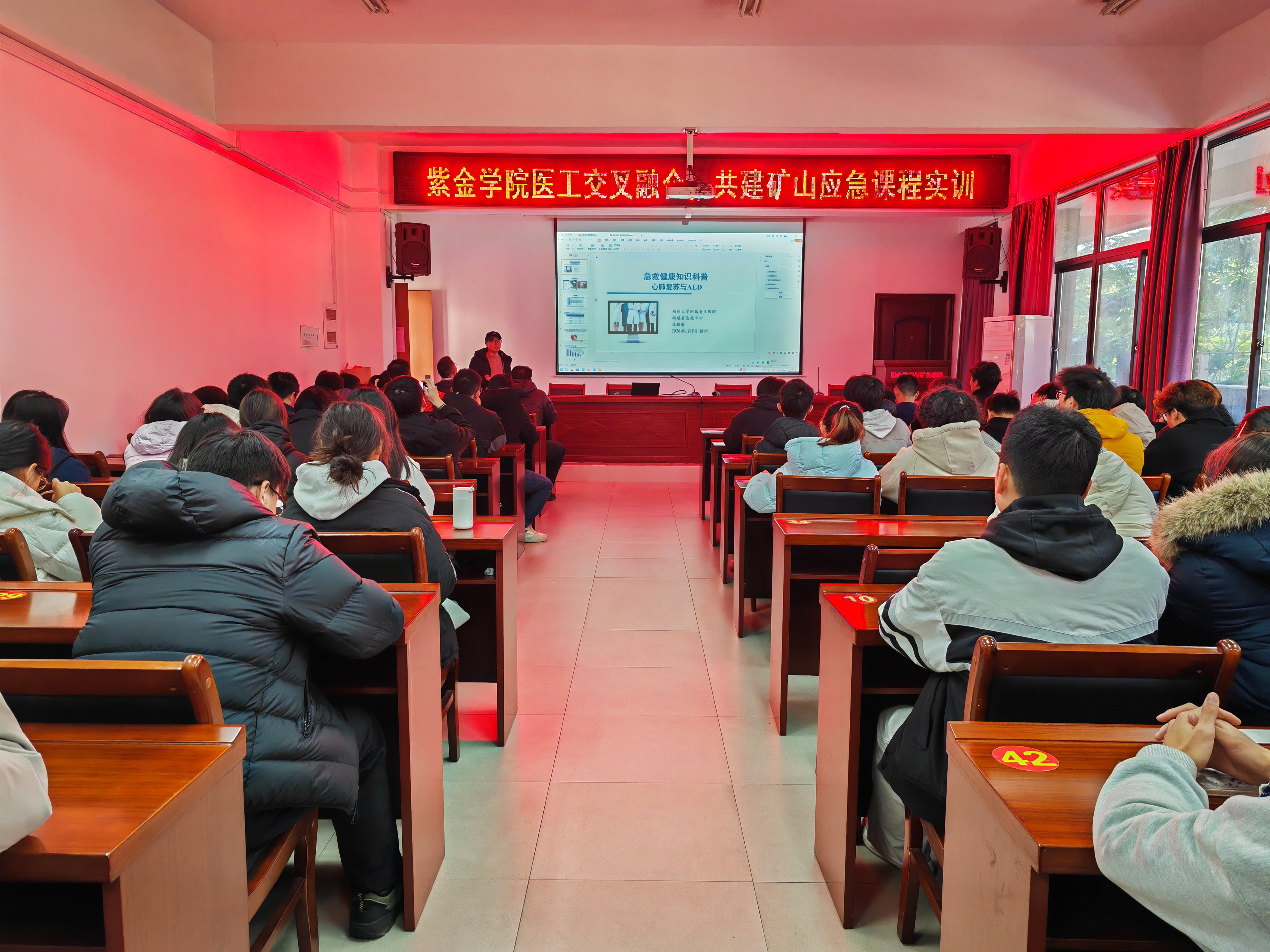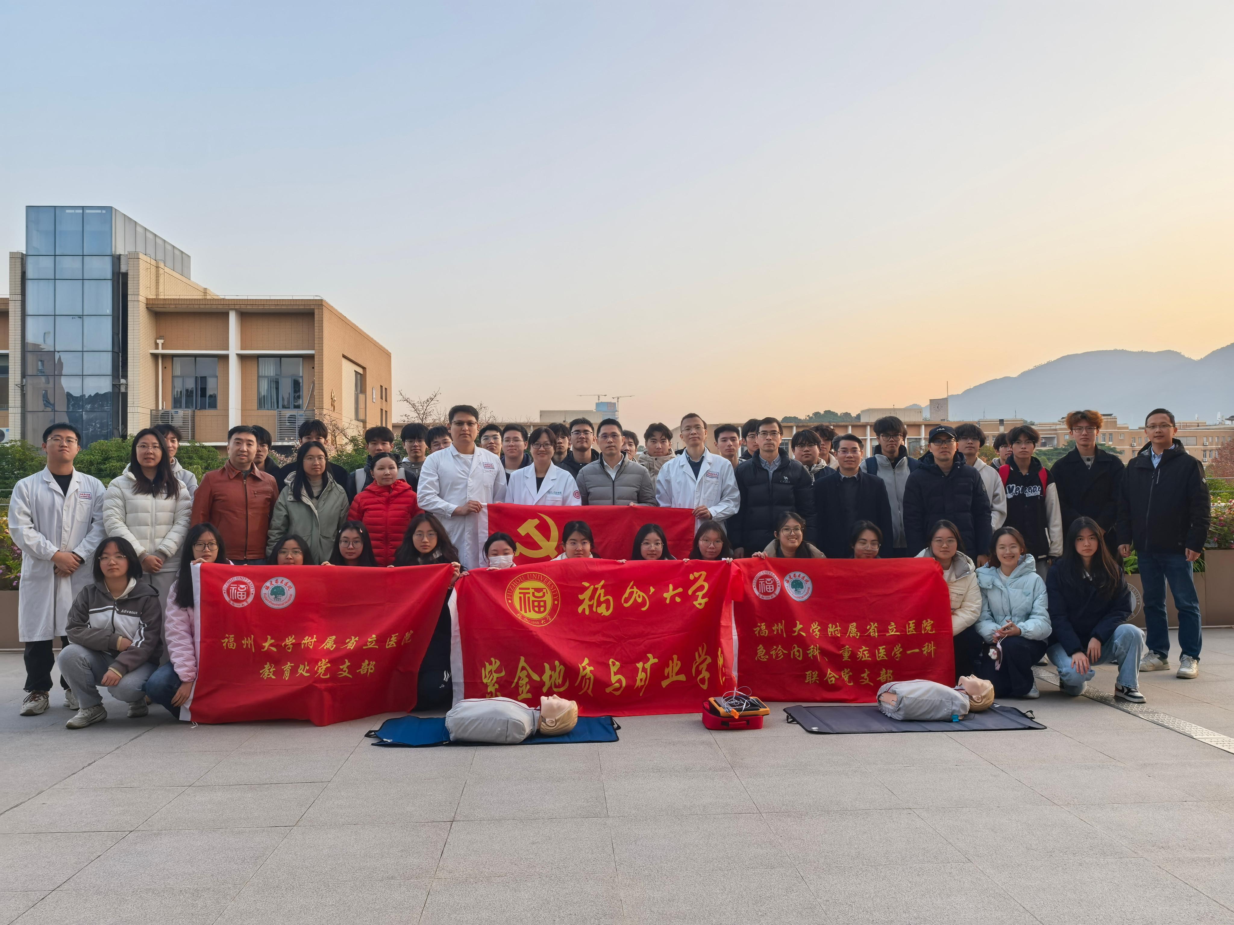 融媒中心讯/为切实增强师生在野外实习、生产实践与日常生活中的突发状况应对能力,进一步筑牢校园安全防线,推动医工交叉融合发展,1月8日,紫金地质与矿业学院联合福州大学附属省立医院共同举办“医工交叉融合,共建矿山应急课程”实训教学活动。活动邀请到附属省立医院教育处负责人谢颖、创伤外科副主任蔡鸿儒以及福建省急救中心专家林世荣走进校园,为学院师生讲授了一堂扎实而宝贵的“生命必修课”。学院党委书记郑寿、副书记张志雄、副院长胡建华等一同参与培训。