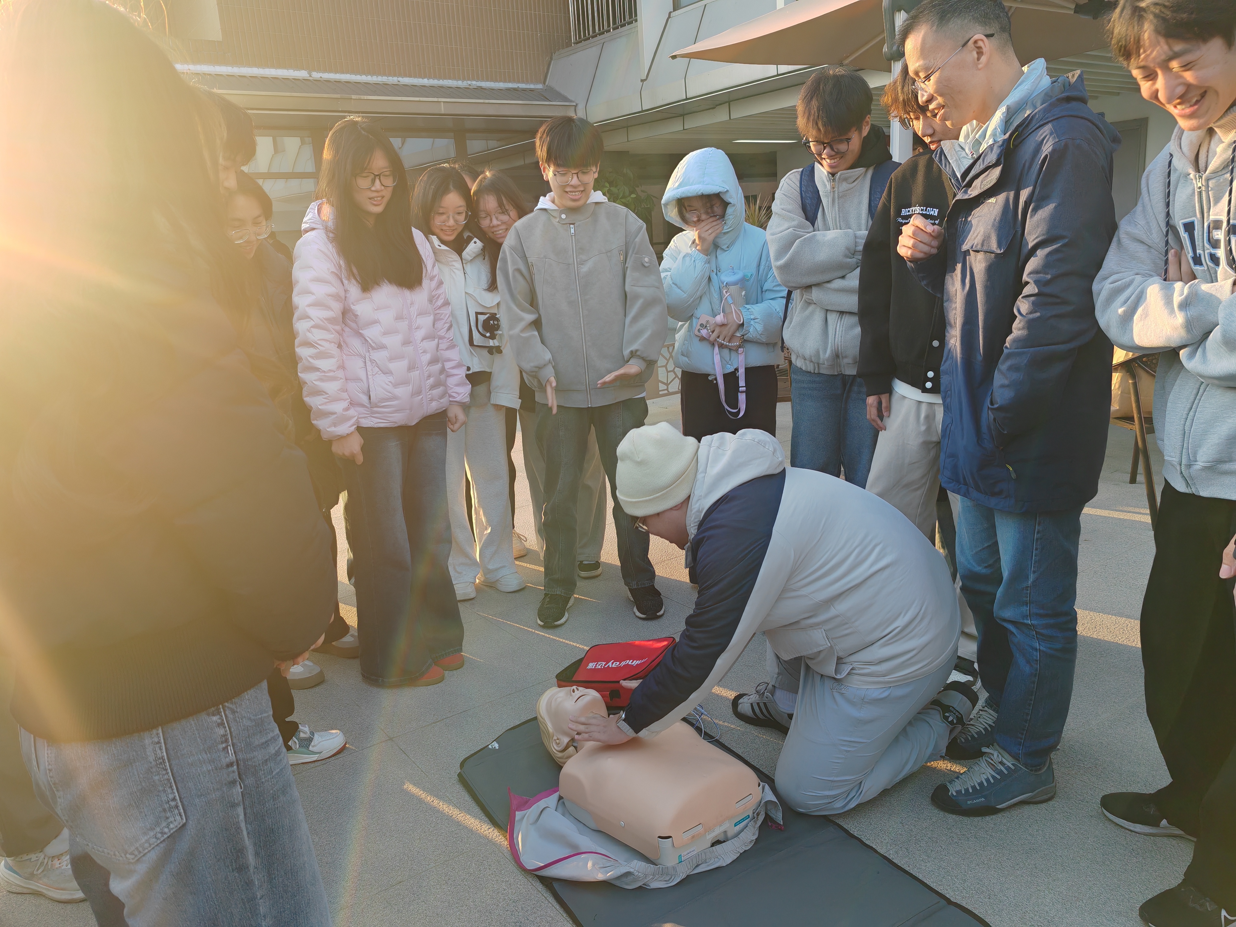 林世荣老师聚焦心肺复苏这一关键急救技术,细致讲解了从现场判断到规范施救的全流程,例如在嘈杂环境中快速评估伤者意识与呼吸、规范实施胸外按压、开放气道、人工呼吸以及AED设备使用等要领,进一步提升了师生在应急情况下处置突发状况的熟练度与信心。