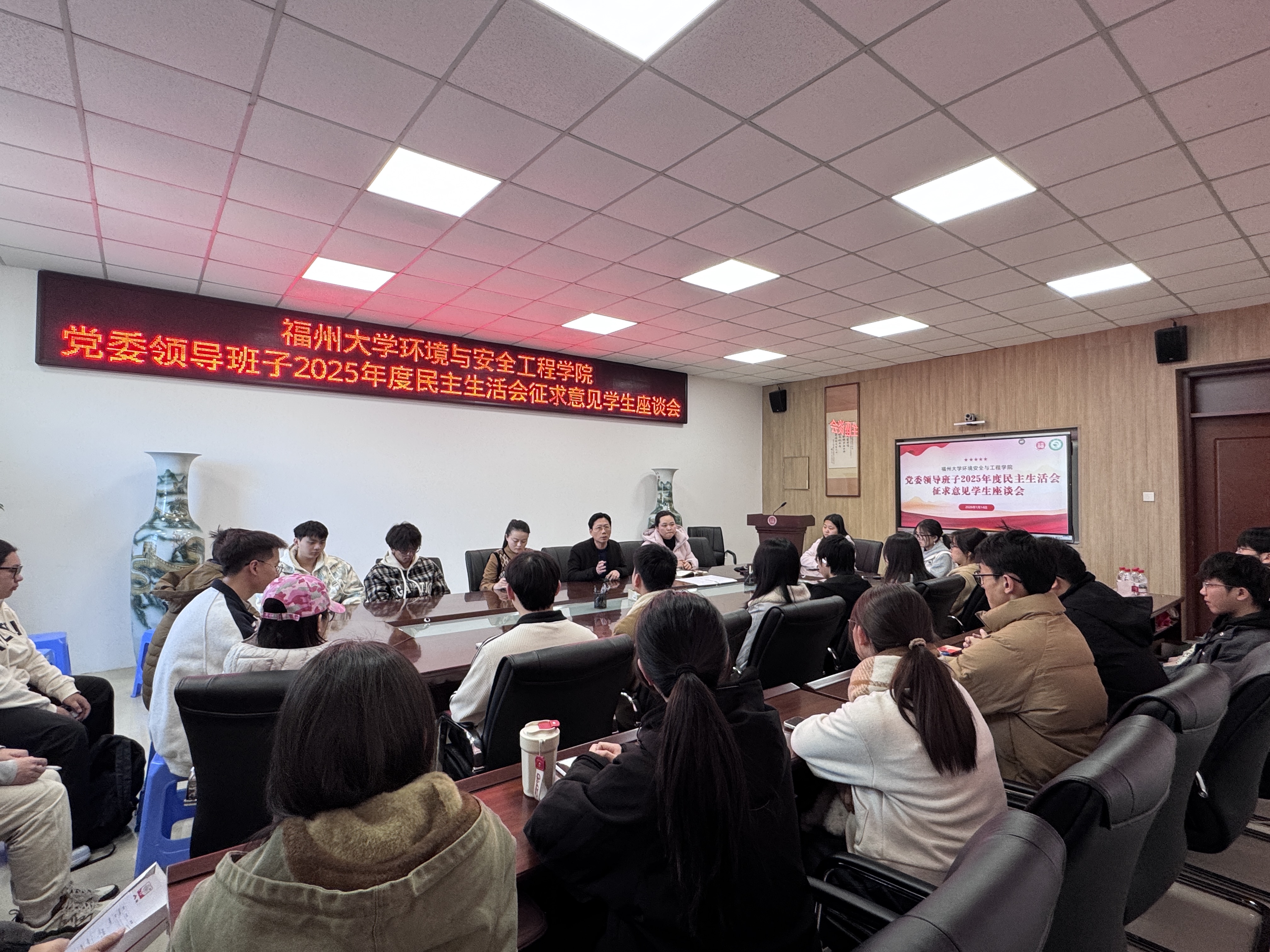 融媒中心讯/为深入学习贯彻习近平新时代中国特色社会主义思想,全面贯彻落实党的二十届四中全会精神,高质量开好2025年度党委领导班子民主生活会,环境与安全工程学院党委于2026年1月14日、16日,分别组织召开两场民主生活会征求意见座谈会,面向学院师生广泛征求意见建议。学院领导班子成员、各系(中心)负责人、党支部书记、教师代表、学生代表等参加座谈。