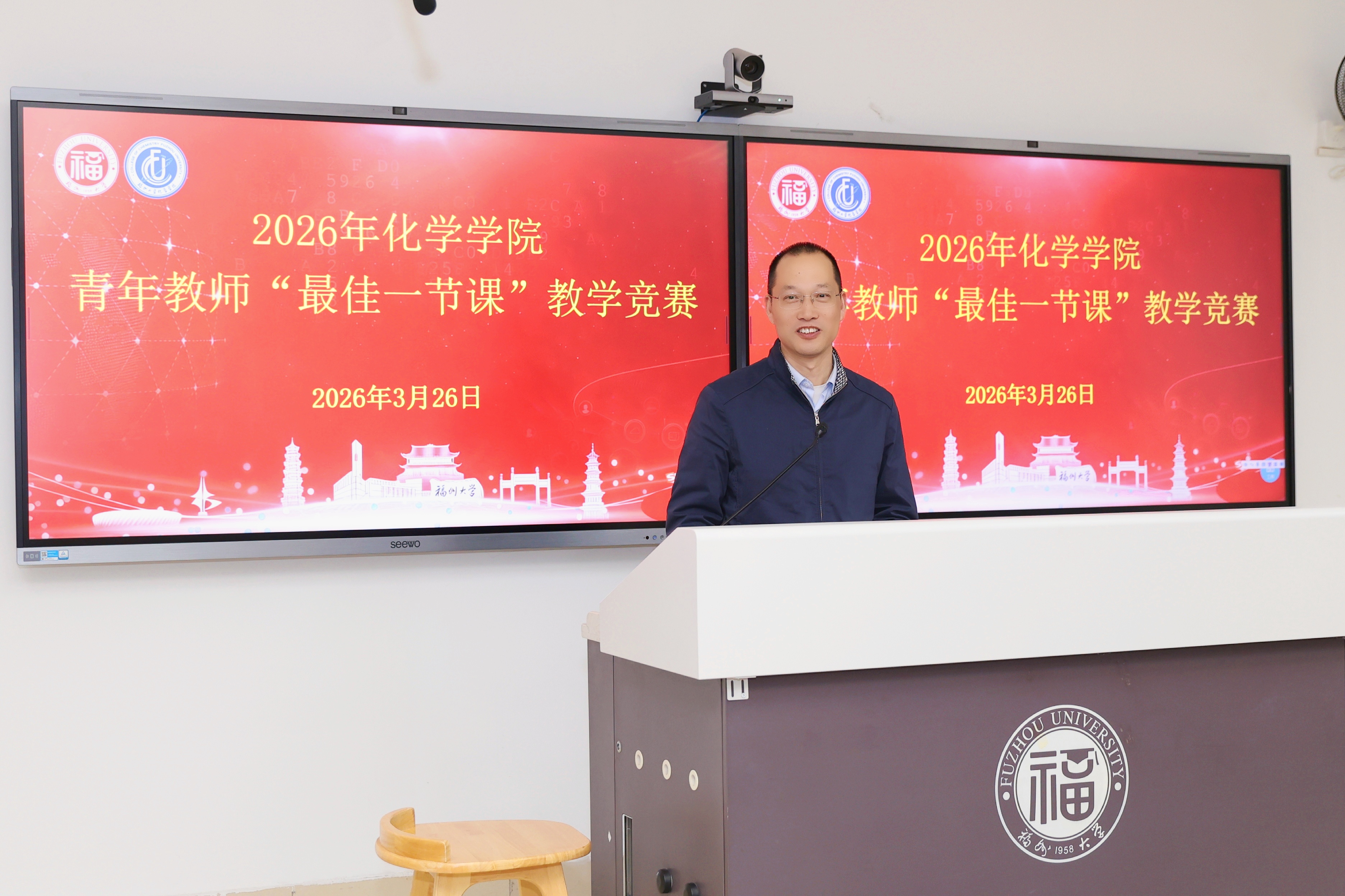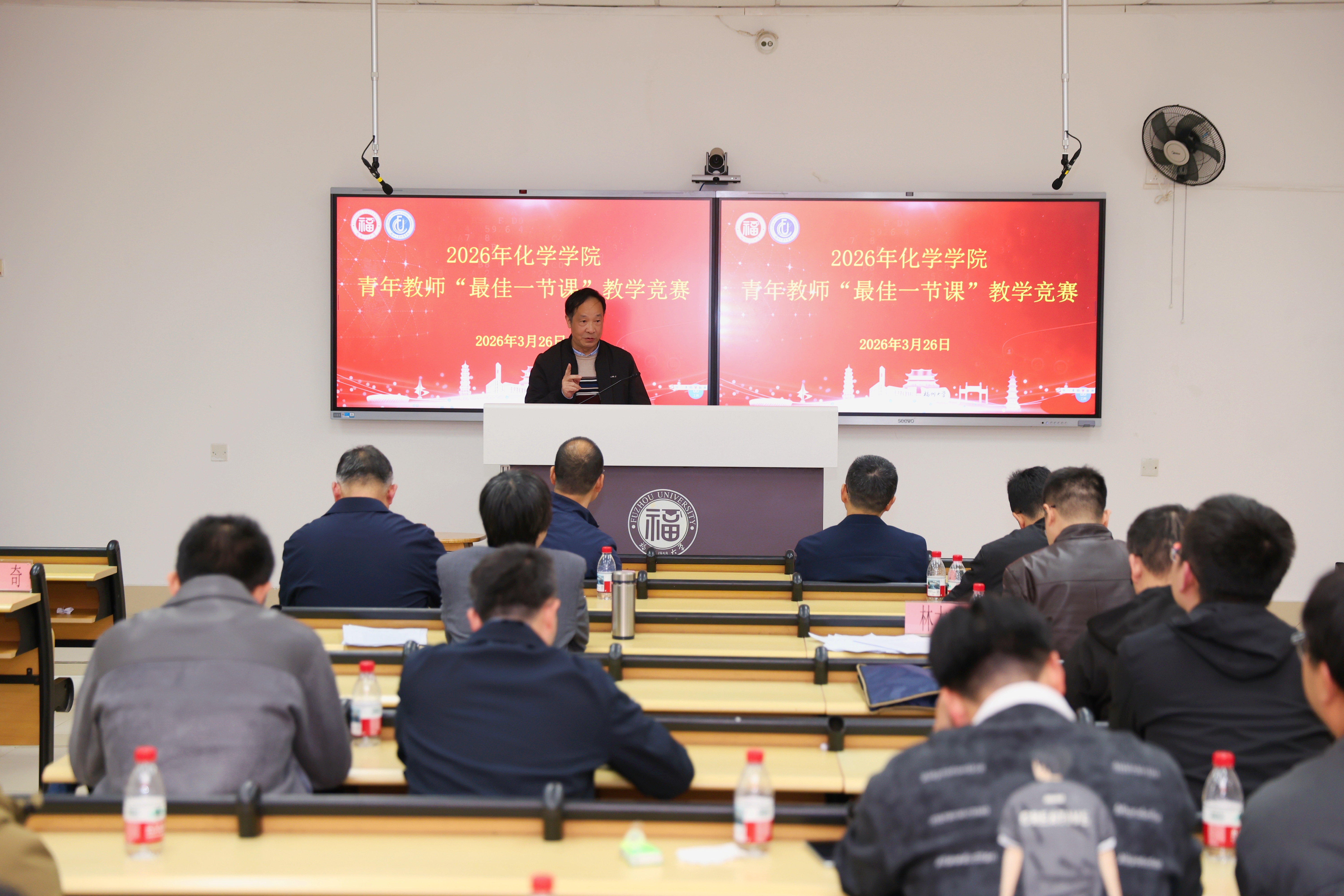 融媒中心讯/3月26日,福州大学化学学院2026年青年教师“最佳一节课”教学竞赛暨福州大学第二十七届青年教师“最佳一节课”选拔赛在教学楼西1-202教室举办。本次竞赛旨在深入贯彻立德树人根本任务,全面提升青年教师教学能力与业务素养,加快推进高水平青年教师队伍建设。学院党委书记曾忠毅、院长钟羽武、副院长林子俺到场指导并全程统筹赛事。赛事由学院工会主席陈珠灵主持。