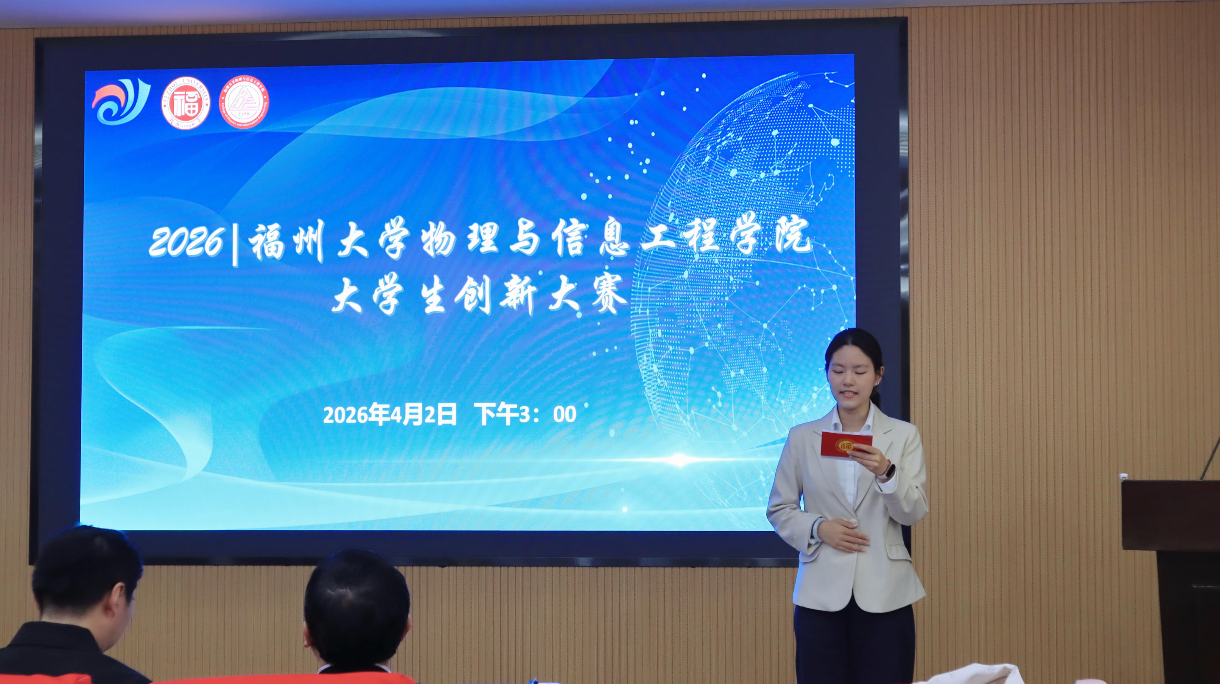融媒中心讯/为深入落实创新创业教育理念,进一步激发学子创新热情、提升学生创新实践能力,4月2日下午,物理与信息工程学院大学生创新大赛(2026)在旗山校区物信学院思源厅举办。本次大赛邀请多位创新创业领域资深专家担任评委,校学生工作部(处)和学院领导到场观摩指导。