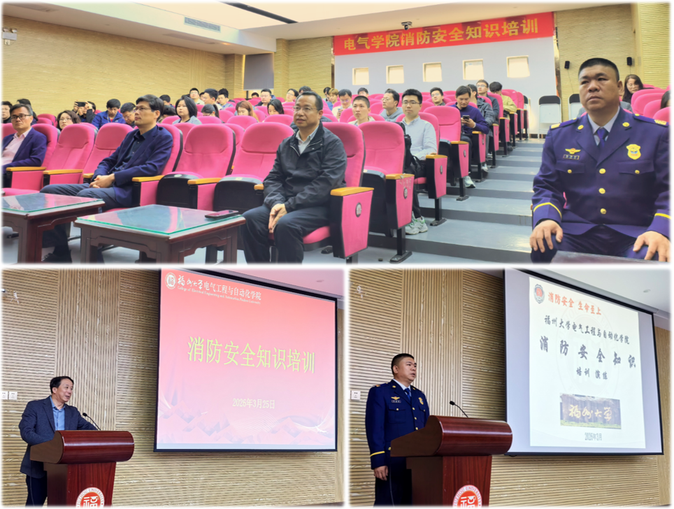 融媒中心讯/近日,福州大学电气工程与自动化学院联合校保卫部在学院楼北230会议厅及机电综合馆9号楼东侧空地举办消防安全知识讲座及消防灭火实操培训。学院党委书记潘志辉、院长邵振国、副院长王武出席活动,校保卫部消防科科长江廷言到场指导,福建省兴盛火迪消防工程集团有限公司一级注册消防工程师林鸿芬教官担任主讲。活动由副院长王武主持。