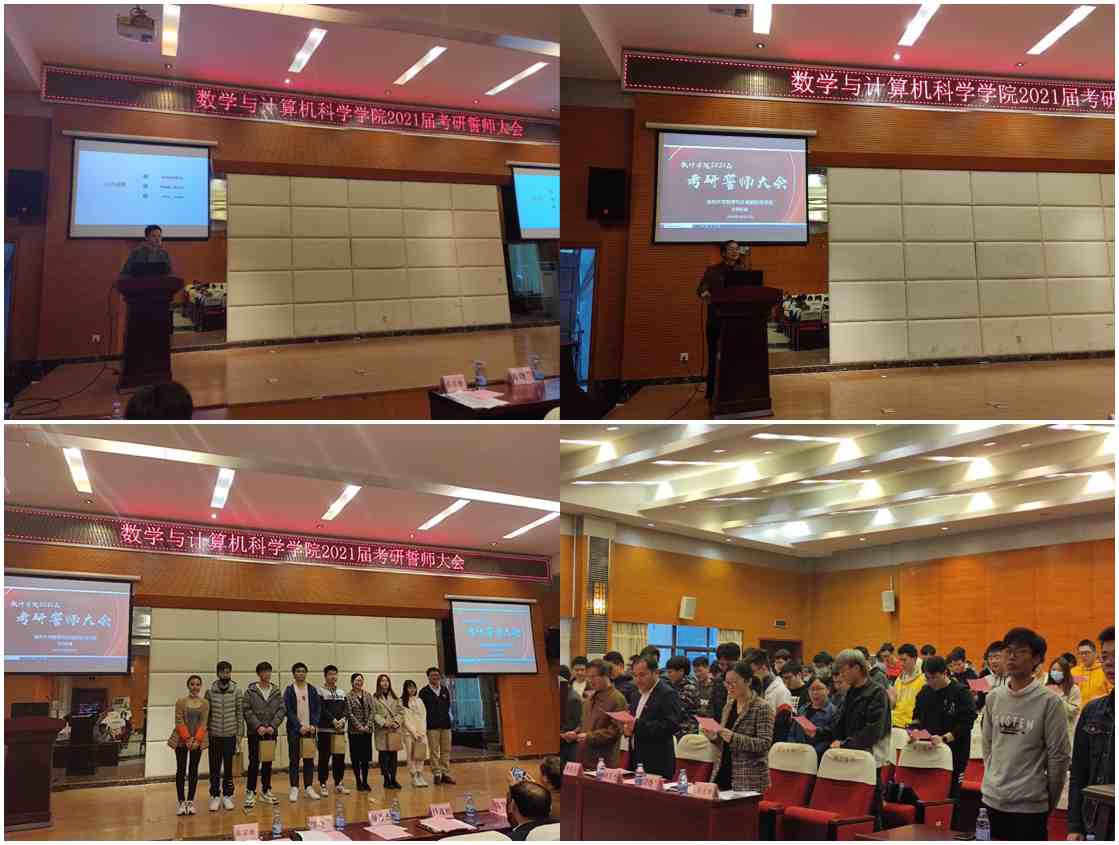 新闻中心讯/12月7日,为激发考研学子的冲刺热情、增强考研信心,数学与计算机科学学院在数计7号楼报告厅举行了数计学院2021届考研誓师大会,擂响最后冲向考研的战鼓,为考研学子们加油鼓劲。学院党委书记陈笃钦、党委副书记傅茂松,以及学工办全体辅导员和2017级考研的同学们参加了本次大会。