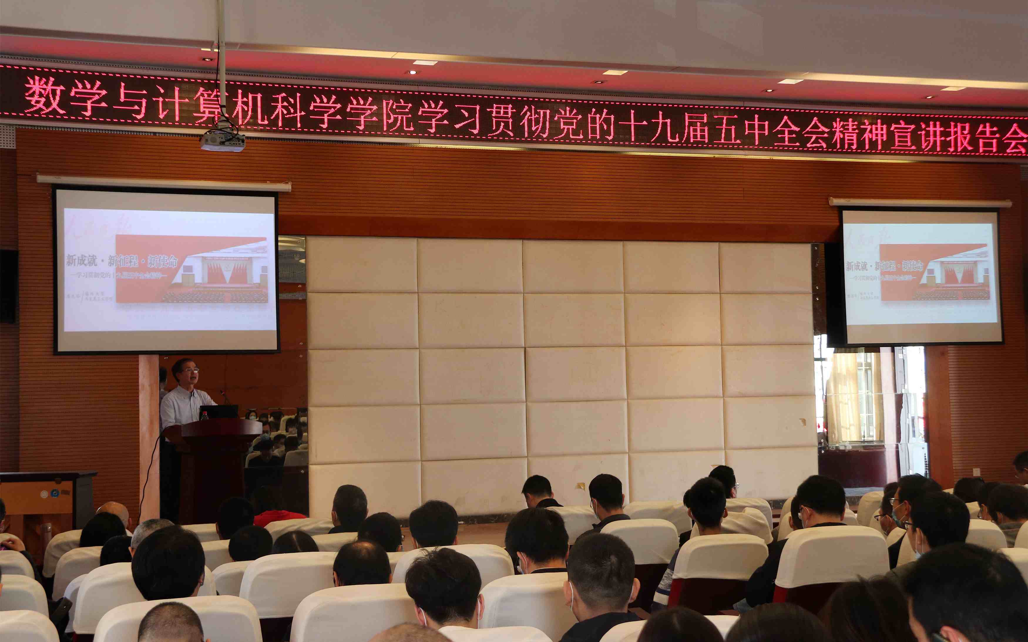 新闻中心讯/12月3日下午,数计学院党委在数计学院7号楼报告厅举行学习贯彻党的十九届五中全会精神宣讲报告会,邀请福州大学学习贯彻党的十九届五中全会精神宣讲团成员、马克思主义学院副院长詹志华教授来院作宣讲报告。报告会由院党委陈笃钦书记主持,全院教职员工及学生党员代表参加了此次报告会。