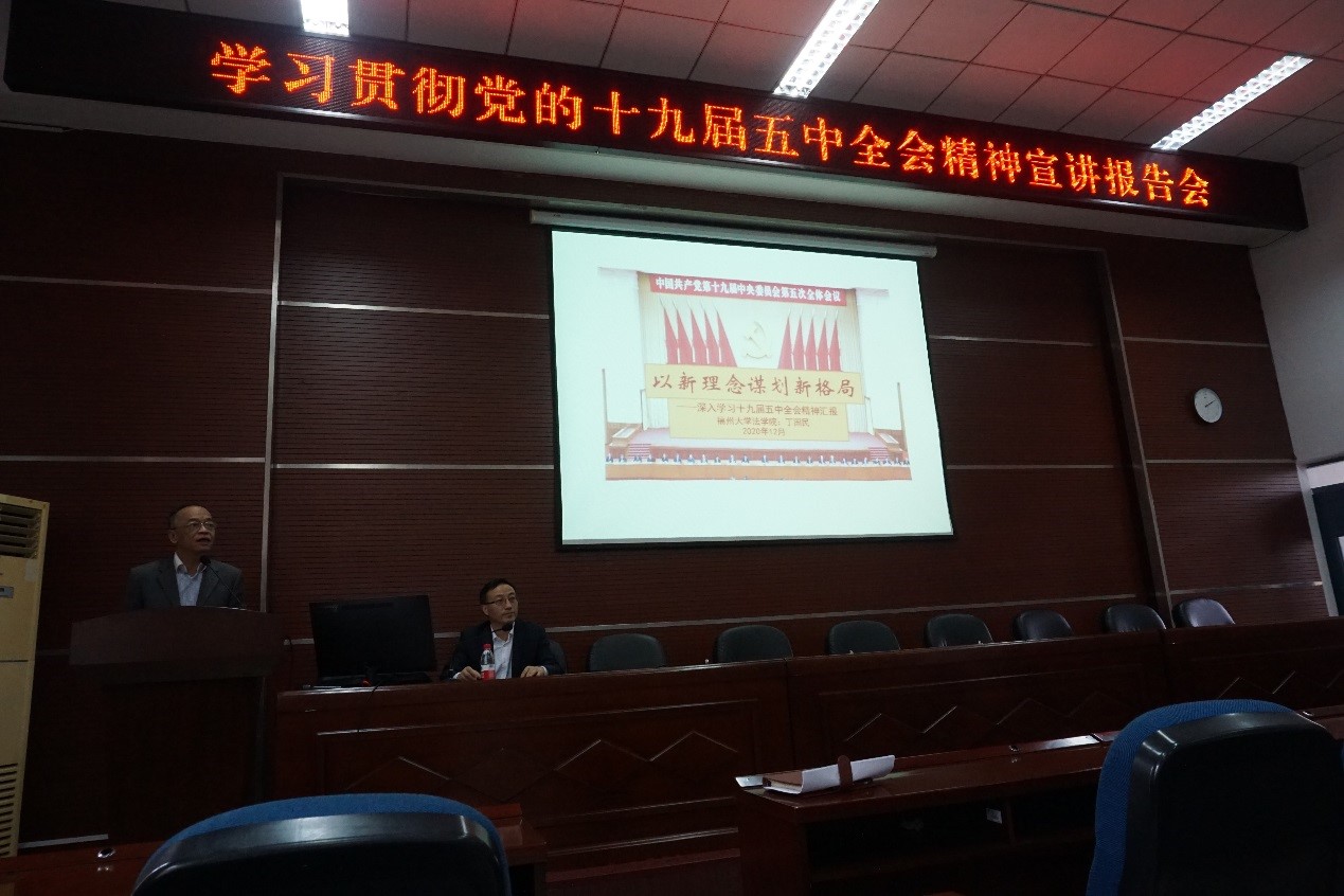新闻中心讯/为进一步深入学习宣传贯彻党的十九届五中全会精神,12月10日下午,外国语学院特邀校学习贯彻党的十九届五中全会精神宣讲团成员,福州大学法学院博士生导师丁国民教授作宣讲报告。报告会由院党委林秋生书记主持,全体教职工和学生党员代表参加。