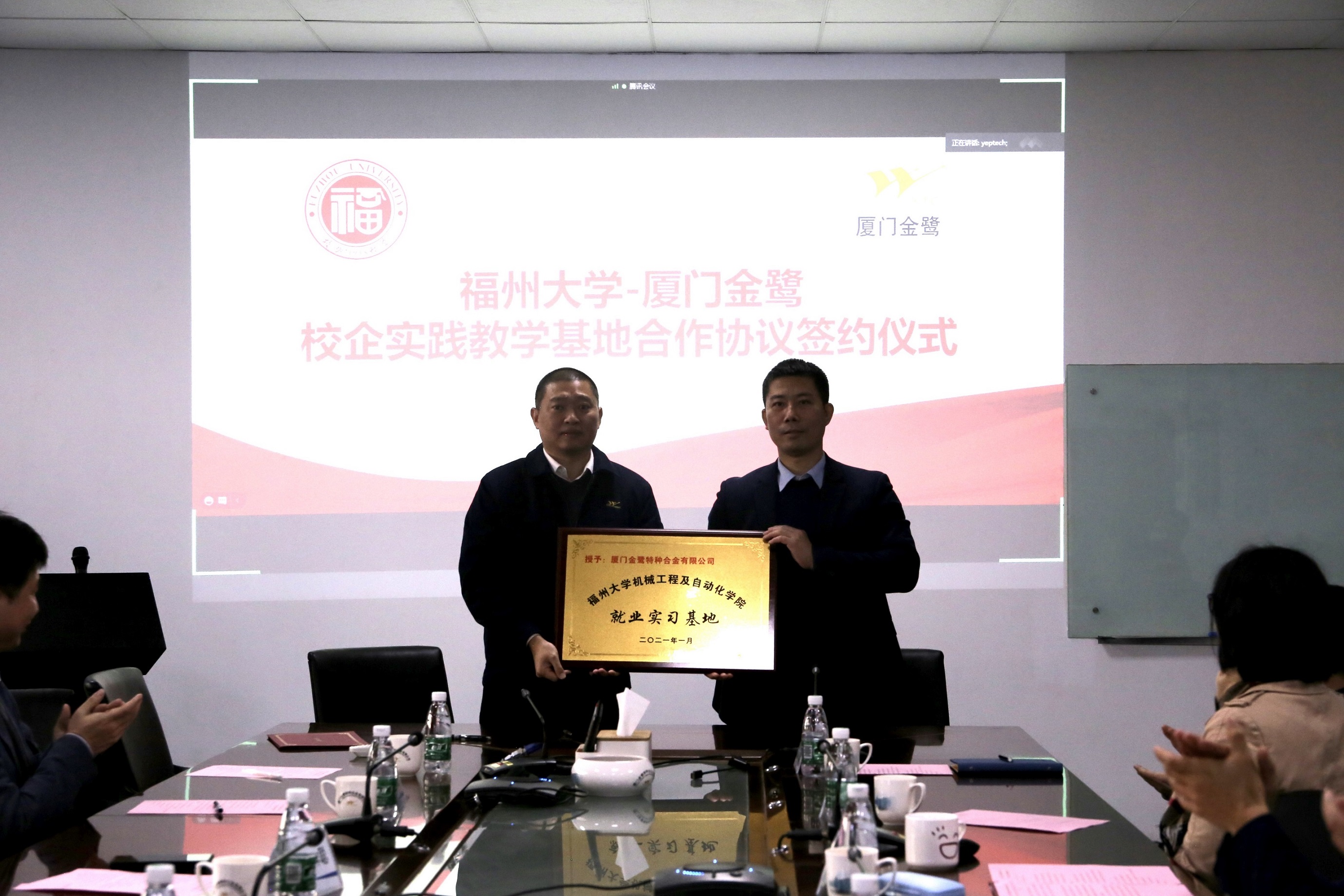 新闻中心讯/1月21日,机械工程及自动化学院与厦门金鹭特种合金有限公司举行就业实习基地签约授牌仪式。厦门金鹭特种合金有限公司副总经理邹建平、人力资源经理陈素艺、产品中试部经理代平、工具技术市场部汽车行业产品经理曾腾辉、棒材国内销售部木工行业销售经理赖国达、机械学院钟舜聪院长、张俊副院长、机电系陈剑雄主任等主要领导以及厦门金鹭5位来自福州大学的储备干部代表出席本次仪式。