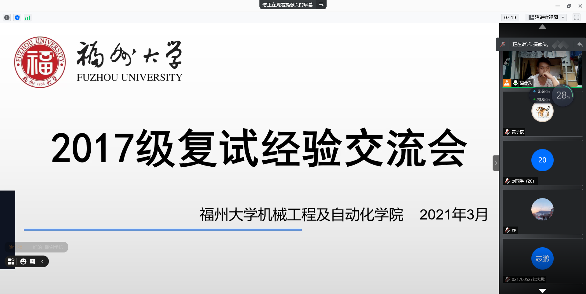 新闻中心讯/3月30日,为帮助2017级考研复试同学在复试环节取得更好的成绩,并充分利用考前时间进行查缺补漏,机械学院利用腾讯会议举办考研复试线上交流会。本次活动由詹贤明、郑坪杨和刘胜伦3位2020级硕士研究生担任分享嘉宾。
