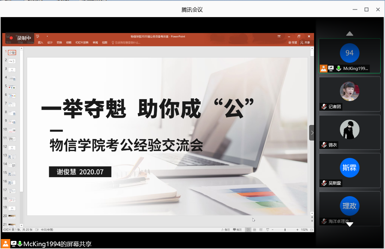 新闻中心讯/7月16日晚,“一举夺魁,助你成‘公’”物信学院考公经验交流会于腾讯会议顺利举行。本次交流会由物信学院2016级辅导员谢俊慧老师主讲,会上气氛活跃,反响热烈。