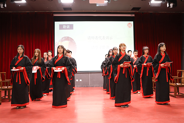“尊师重道,华夏之风”。迎新大会的尾声是人文学院独具特色的拜师礼环节,同学们身穿汉服以古礼拜今师,老师们也由衷祝福同学们有个精彩的未来。
