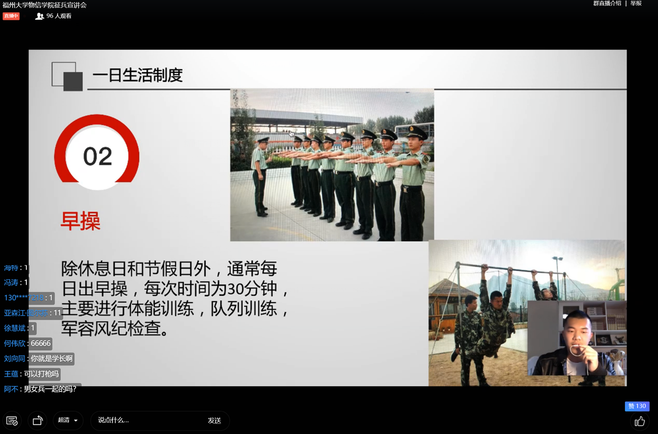 新闻中心讯/4月30日下午,物理与信息工程学院“热血青春 献身军营”征兵云宣讲会活动通过钉钉平台网络直播的形式顺利举行。此项活动由学校学生工作部(处)主办、物理与信息工程学院承办,2014级电子科学与技术专业退伍复学大学生欧相甫同学主讲。本次征兵云宣讲活动气氛活跃、反响热烈,一小时互动数达千次。