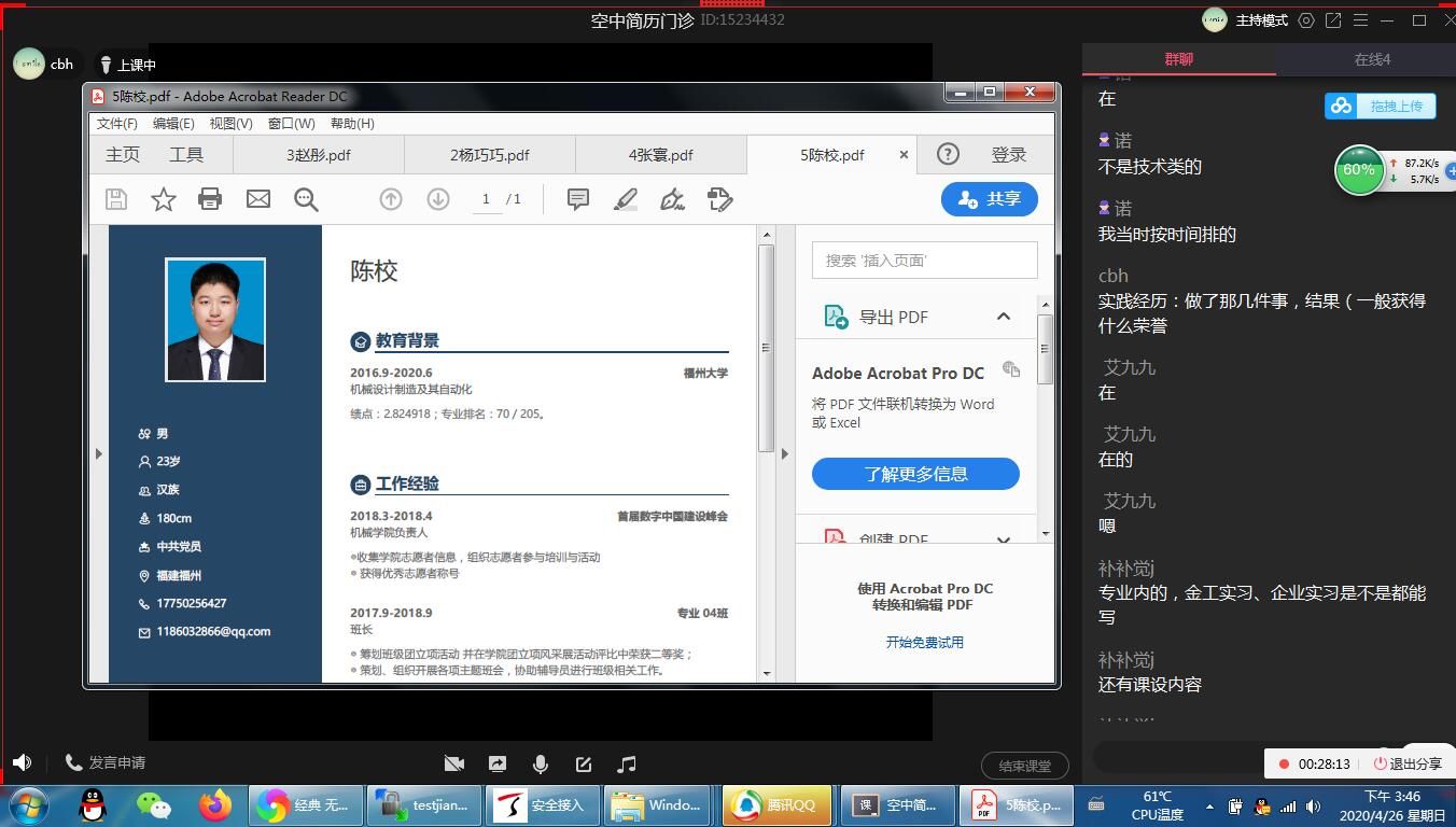 此外,学院为目前存在就业困难学生开展“空中简历门诊”活动。“空中门诊”邀请了学院4名辅导员老师对学生简历进行一对一在线指导,在线帮助学生答疑解惑。自疫情发生以来,学院已有60多名应届毕业生通过网络平台得到简历指导,并成功进入面试环节。