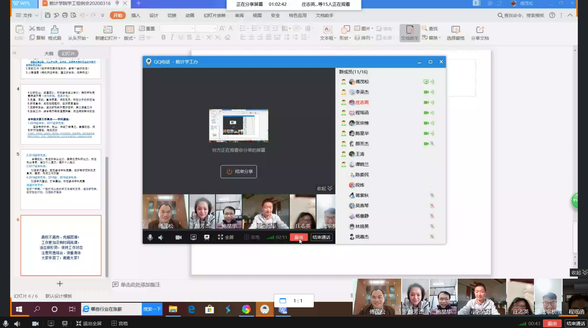 新闻中心讯/疫情防控工作开展以来,数计学院学工办紧紧围绕习近平总书记关于疫情防控工作的系列重要讲话和指示批示精神,以及党中央、国务院的决策部署和教育部、省委省政府、学校的工作要求,认真开展各项防疫工作。3月16日下午,学院学工办通过QQ视频召开线上学工办例会,就防疫工作和常规工作进一步做出相关要求和安排。会议由院党委副书记傅茂松主持,学工办全体专兼职辅导员参加了本次会议。