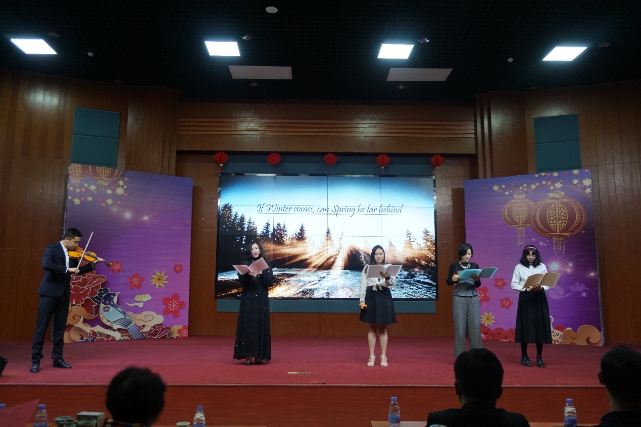 本场联欢会极具多元文化因素。联欢会在极具特色的《太鼓》声中拉开帷幕。舞蹈《洛水佳人》《浪人琵琶》是对中华优秀传统文化的演绎,彰显中国韵味,充分展示了外院师生的张力与活力,赢得现场经久不息的掌声。英语系师生的小提琴伴奏英文朗诵,以及德语系、英语系外教及教师带来了精彩的中英德多语种小合唱《欢乐颂》,展示了多元文化的外院特色。公研教研室的女生小合唱《我们的生活充满阳光》洋溢着温情。退休教师赖斌、卓培娴的诗歌朗诵《老了》《老教师之歌》,情真意切,饱含真情,引起了大家的共鸣。现代舞《Flower Shower》和韩语二重唱《南行列车》以欢快点燃了大家的激情。小品《照镜子》《机器人》让会场充满了笑声。联欢会在激情大合唱《我和我的祖国》的歌声中落下帷幕。