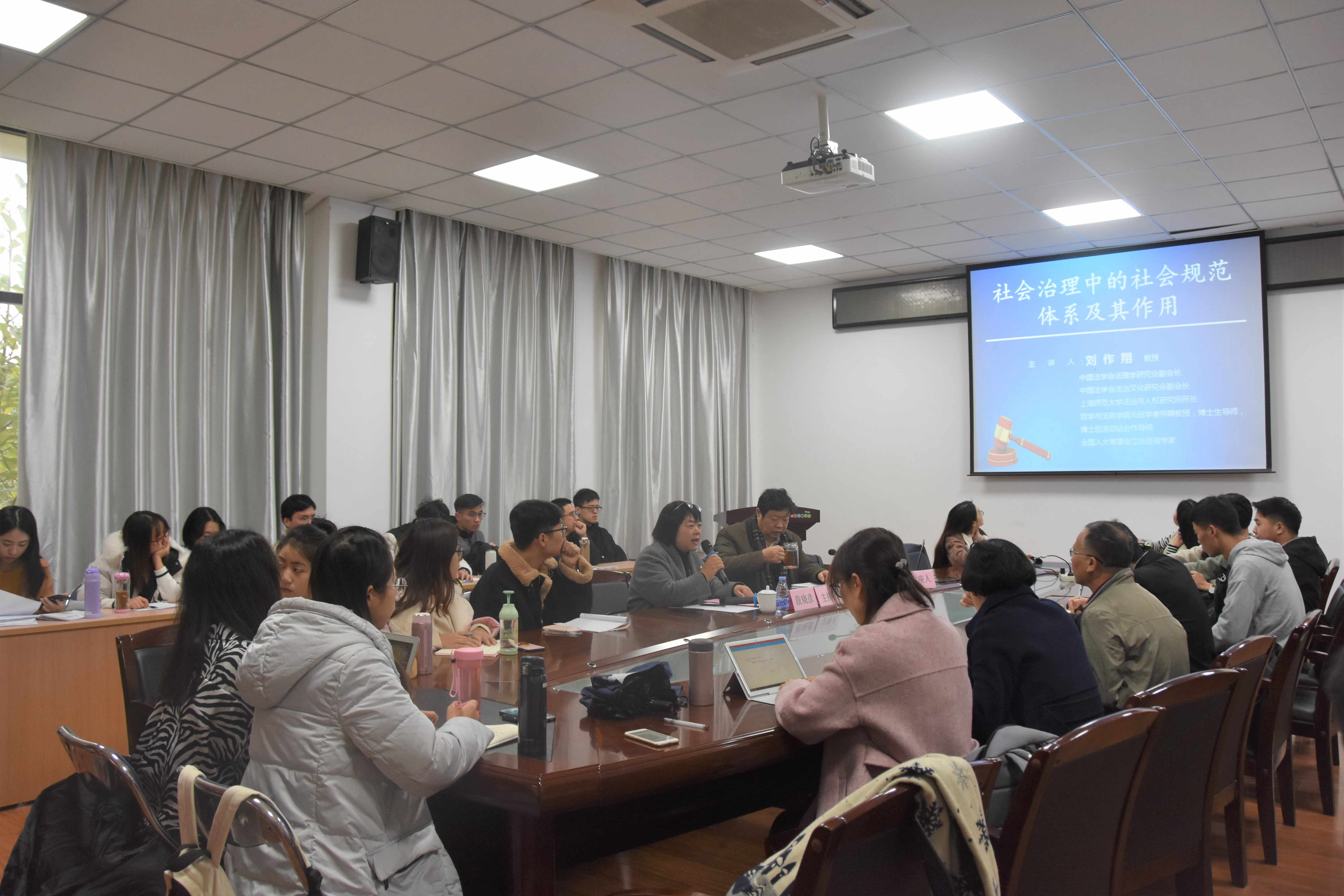 讲座伊始,刘作翔教授从我国现行法律体系中存在的相关问题谈起,介绍了社会规范体系提出的背景及其必要性。紧接着,刘作翔教授阐述了社会规范体系的结构并将其具体分为习惯、道德、宗教、自制规范四大部分进行细致论述。结合现实案例,刘作翔教授进一步提出了“社会规范体系的制定要遵循合法性、合理性的原则,并应当建立完备的审查机制以保障该原则”这一观点。讲座最后,刘作翔教授就社会规范体系的具体适用与审查机制的建立等问题与在场师生互动交流,现场气氛热烈。