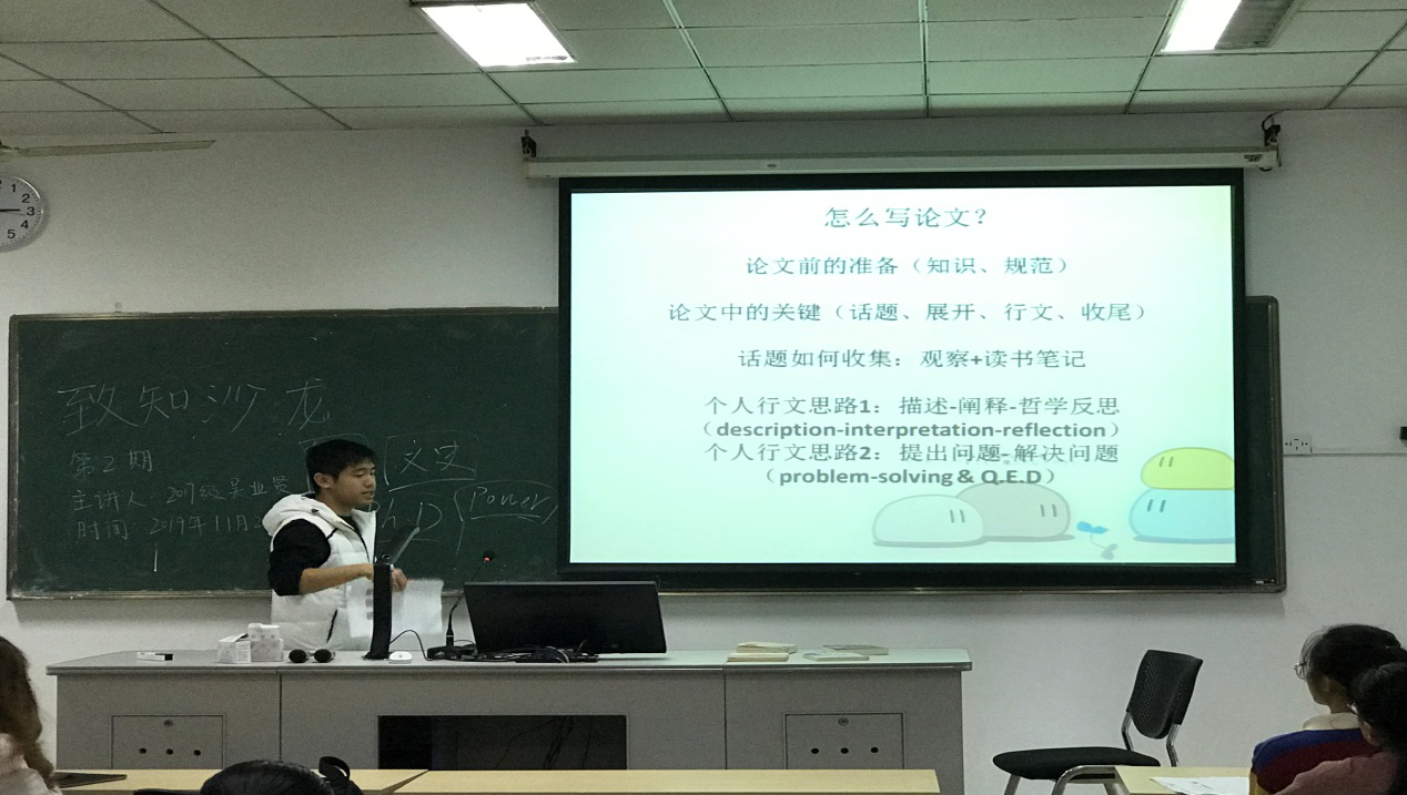 新闻中心讯/11月21日下午,由外国语学院研究生会承办的第七期“致知沙龙”学术活动在外国语学院405教室顺利举行。本期学术沙龙活动由2017级英语语言文学专业研究生吴业贤担任主讲人,2019级研究生同学到场聆听交流。