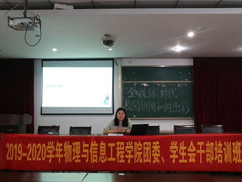 新闻中心讯/11月14日,2019-2020学年物理与信息工程学院团委、学生会干部培训班第二讲在物信南楼111举办,本次邀请到了福州大学党委宣传部王忆希老师,王忆希老师以“‘全媒体’时代,校园新闻如何出彩”为主题,为学院宣传干部及宣传委员们带来了精彩的一课。