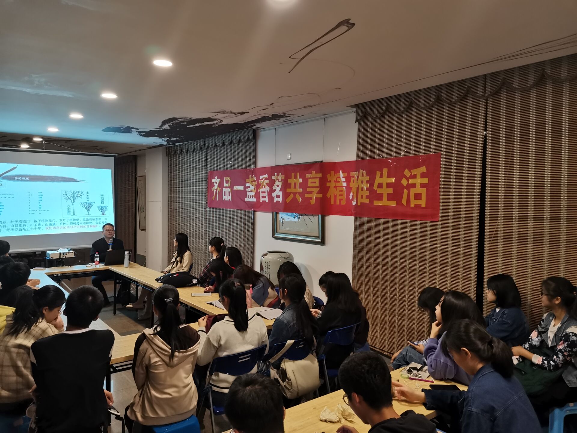 本次活动不仅有茶道的理论宣讲,还有具体的品茶知识讲解。在活动的互动环节,现场听众积极参与,同学们踊跃发言,表达自己的见解,呈现出一派欢乐气氛。