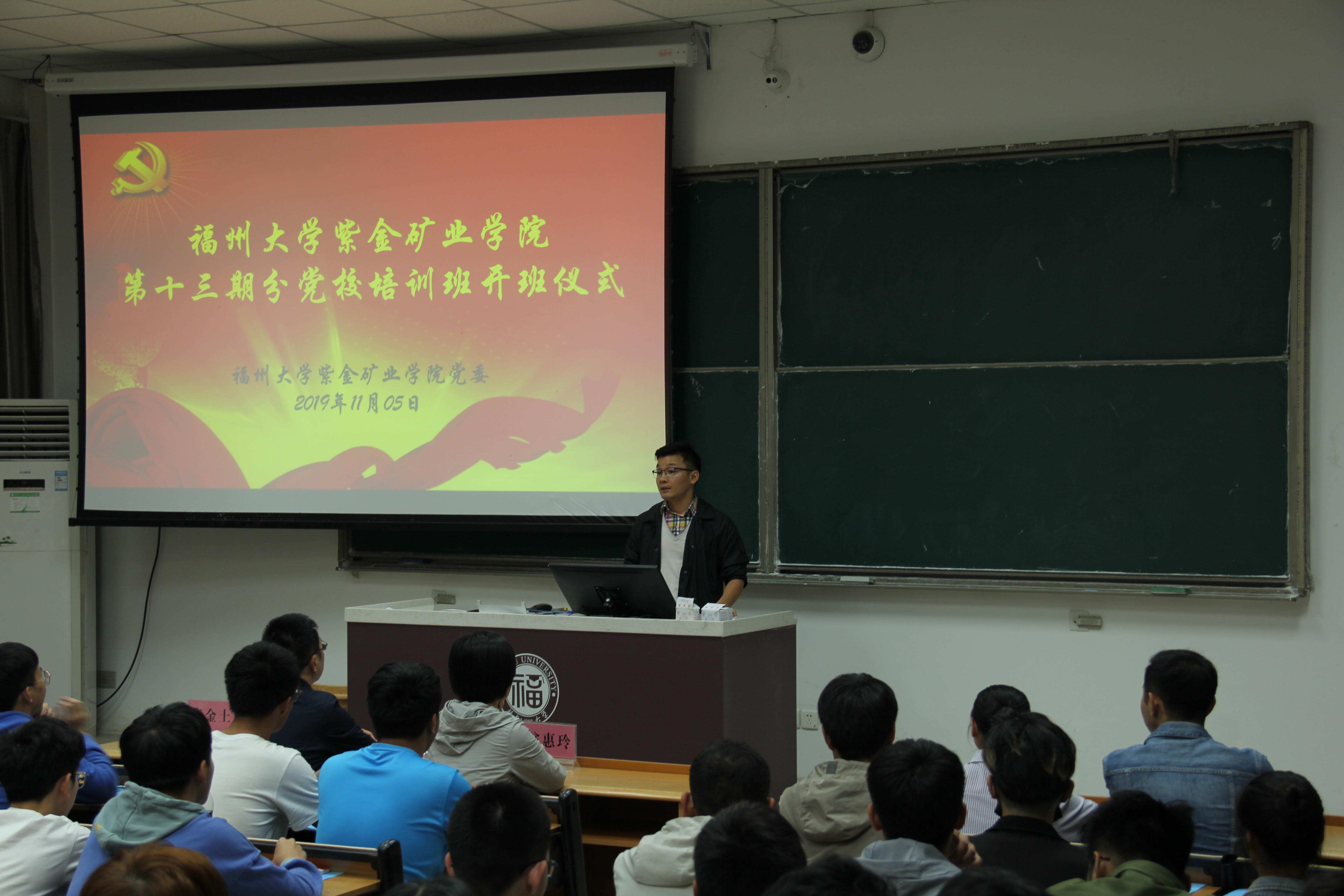 新闻中心讯/11月5日晚,紫金矿业学院于西三103教室召开第十三期分党校培训班开班仪式,学院院党委副书记郑寿、院团委书记李金土、16、17级辅导员翁惠玲出席了本次开班仪式,95名入党积极分子参加本次开班仪式。