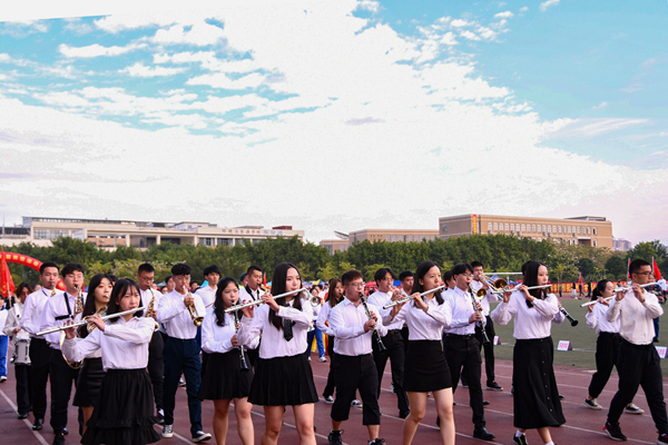 开幕会伊始,人文学院高举学院旗帜向前走来,步履一致、精神焕发。在响亮的口号声下,人文学院整齐划一的方阵走到主席团中央。随后,人文学院管弦乐团进行现场演奏。人文学子充分发挥的专业和特长,古筝余音悠扬,琵琶古韵婉转,管乐清新优雅……出色的表现以及娴熟的技艺,让在场的同学沉浸在音乐艺术的熏陶之中。紧接着,热情的现代舞表演展示了人文学子的运动活力,为参加校运会的运动员助力。现场挥舞的小红旗,也表达了对祖国成立70周年献礼的祝福。
