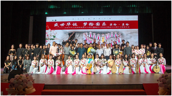 新闻中心讯/为庆祝中华人民共和国成立七十周年暨福州大学民族管弦乐团成立十周年,10月27日晚,由福州大学人文社会科学学院主办、福州大学民族管弦乐团承办的“盛世华诞 梦拾国乐——柒拾·熹拾”民乐专场音乐会于在福州大学旗山校区宏晖文体馆举行。本场音乐会由福州大学民族管弦乐团演奏,张晓娟老师担任乐团指挥并负责全场节目的艺术指导。本场音乐会吸引了福州大学以及闽江学院、阳光学院等周边高校的师生前来观看,现场近千名师生以及社会各界人士一起共享本场视听盛宴。
