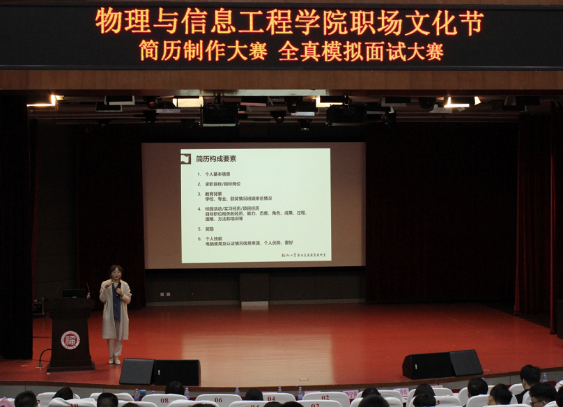 新闻中心讯/11月1日晚,物信学院职场文化节之简历制作大赛暨全真模拟面试大赛在博学厅顺利举行。为模拟全真的面试环境,让参赛选手和观众朋友们有更逼真的情景感,本次比赛学院邀请了福州瑞芯微电子股份有限公司招聘经理赖宁莎女士、锐捷网络人力资源部经理黄霄女士、福州大学就业创业指导中心汪静筠老师、物信学院团委书记徐红梅老师,2018级辅导员程章威老师担任评委。到场的嘉宾还有瑞星微电子股份有限公司校招负责人黄玉龙先生、物信学院团委副书记罗奕帆老师,2017级辅导员方德汕老师、2019级辅导员苏海姬老师。