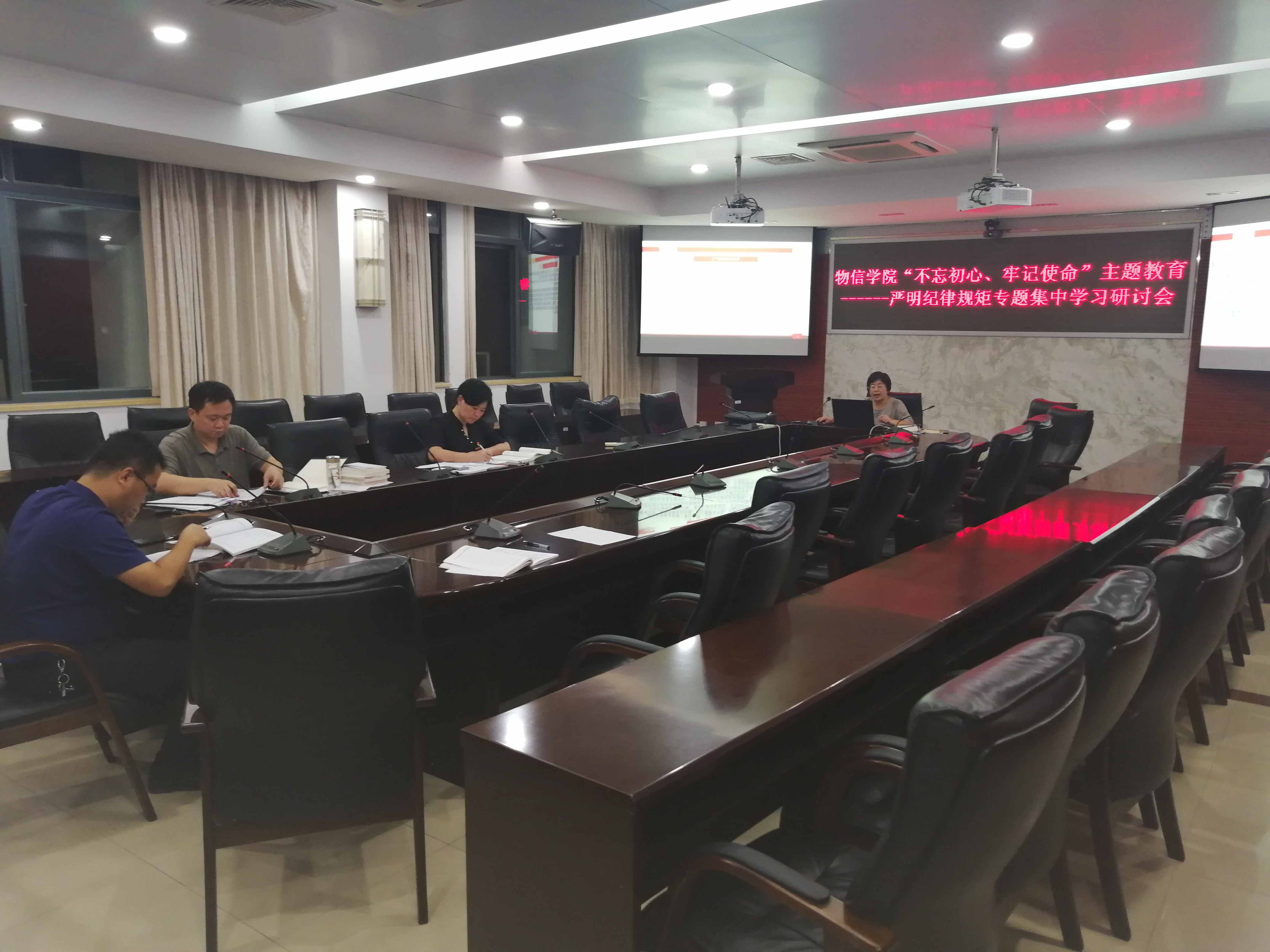 新闻中心讯/10月9日晚上,物信学院召开“不忘初心、牢记使命”主题教育第六专题集中学习研讨会,围绕“严明纪律规矩,永葆政治本色,营造风清气正良好政治生态”开展研讨,学院副处级以上干部(含校聘)、党委委员等参加。