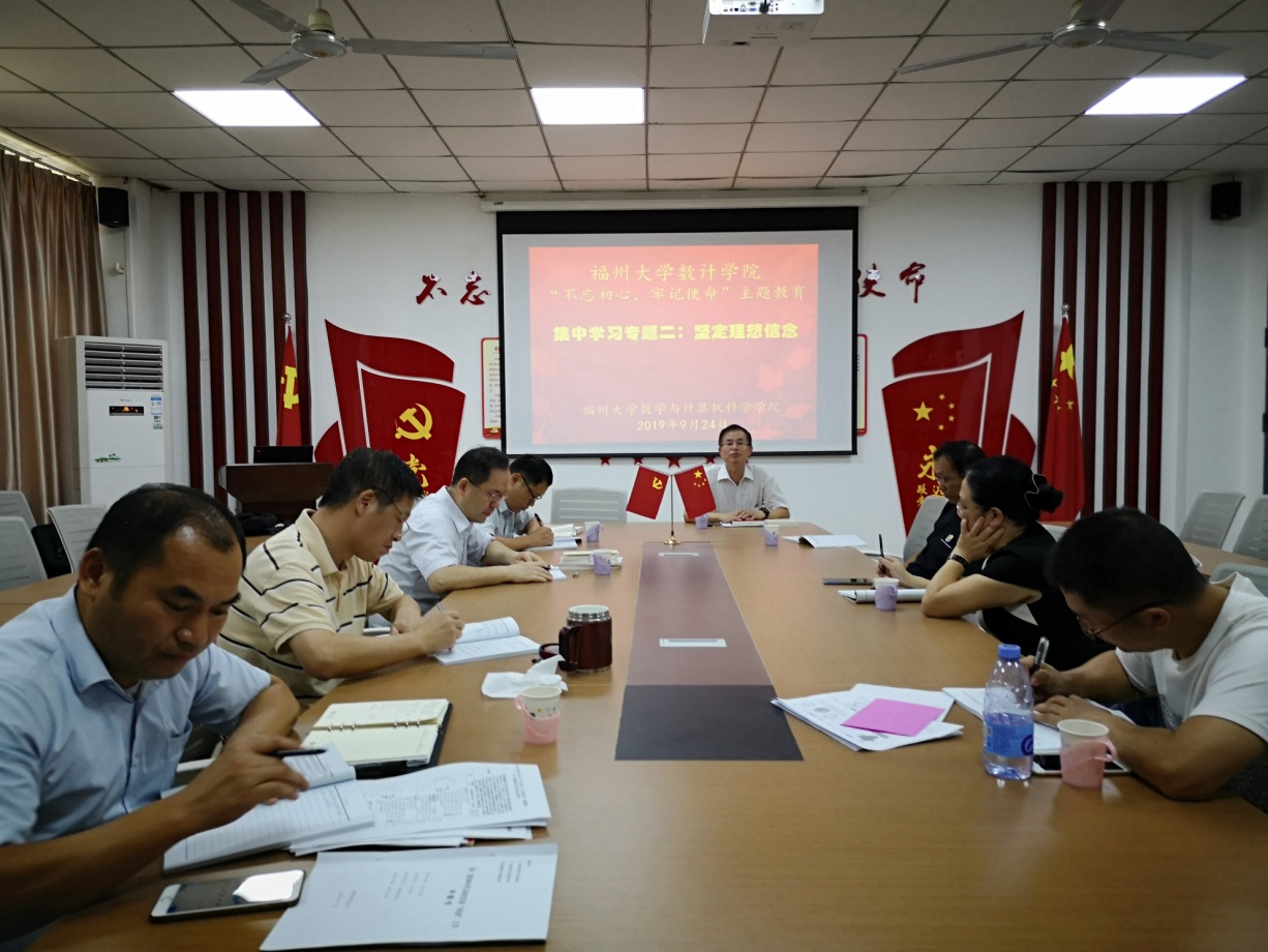 当天下午,学院党委在数计学院2号楼104党建活动室进行了“不忘初心、牢记使命”主题教育第二专题“坚定理想信念”的集中学习研讨,党委领导班子成员和学院处级党员干部参加本次学习会议。会议由数计学院党委陈笃钦书记主持,由侯建锋副院长领学。