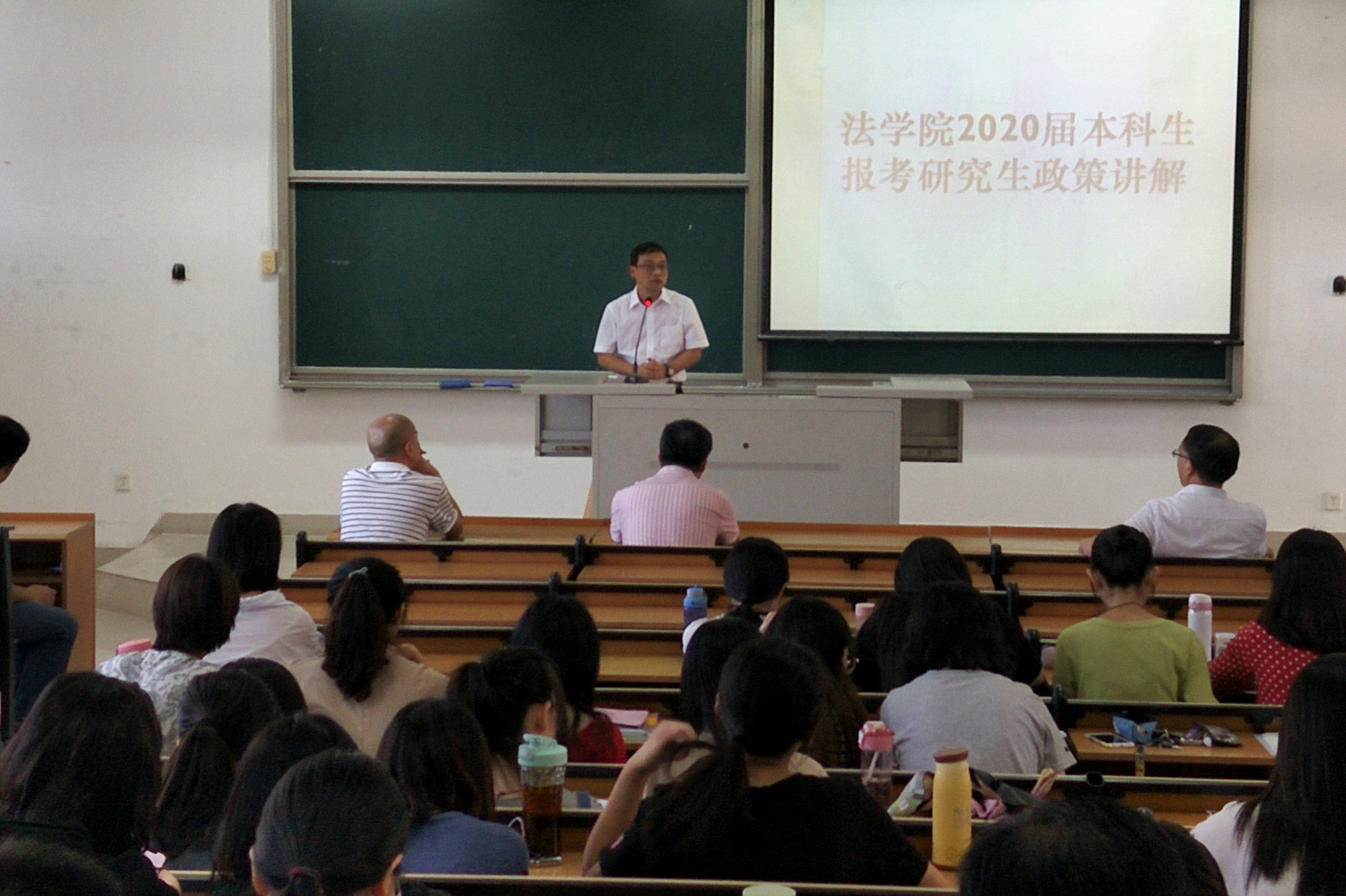 新闻中心讯/9月6日,福州大学法学院2020届本科生报考研究生政策讲解会于福州大学旗山校区文二教学楼405室顺利举行。福州大学法学院院长黄辉教授、党委蔡剑英副书记、副院长丁国民教授、院长助理张旭东教授出席本次讲座,法学院全体2020届本科生参加此次讲座。