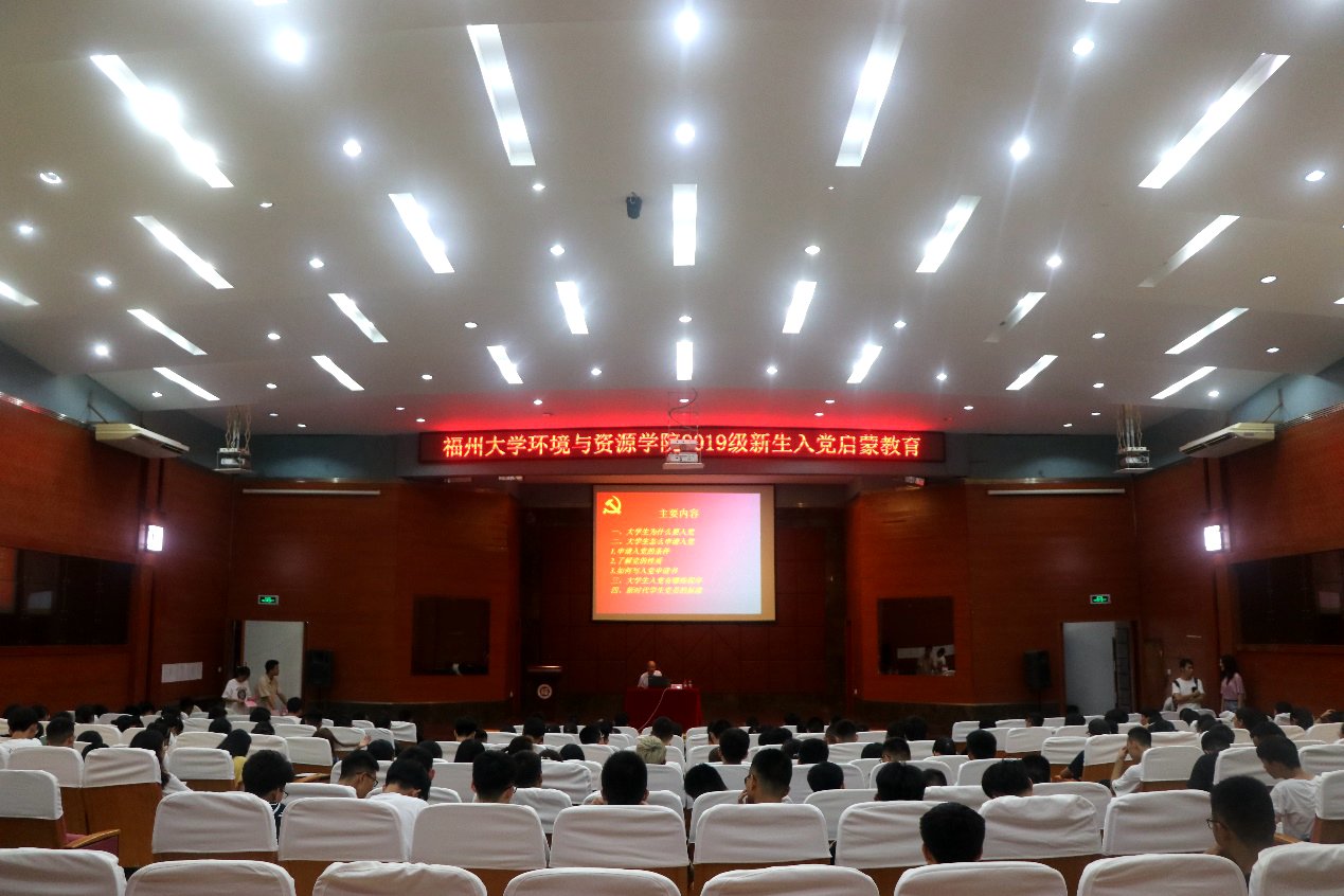 新闻中心讯/9月6日下午,福州大学环境与资源学院2019级新生入党启蒙教育于嘉锡厅顺利举办。此次入党启蒙教育旨在增强新生对党的认识,端正入党动机,明晰入党程序与标准。学院近200名本科新生参加了本次入党启蒙教育。