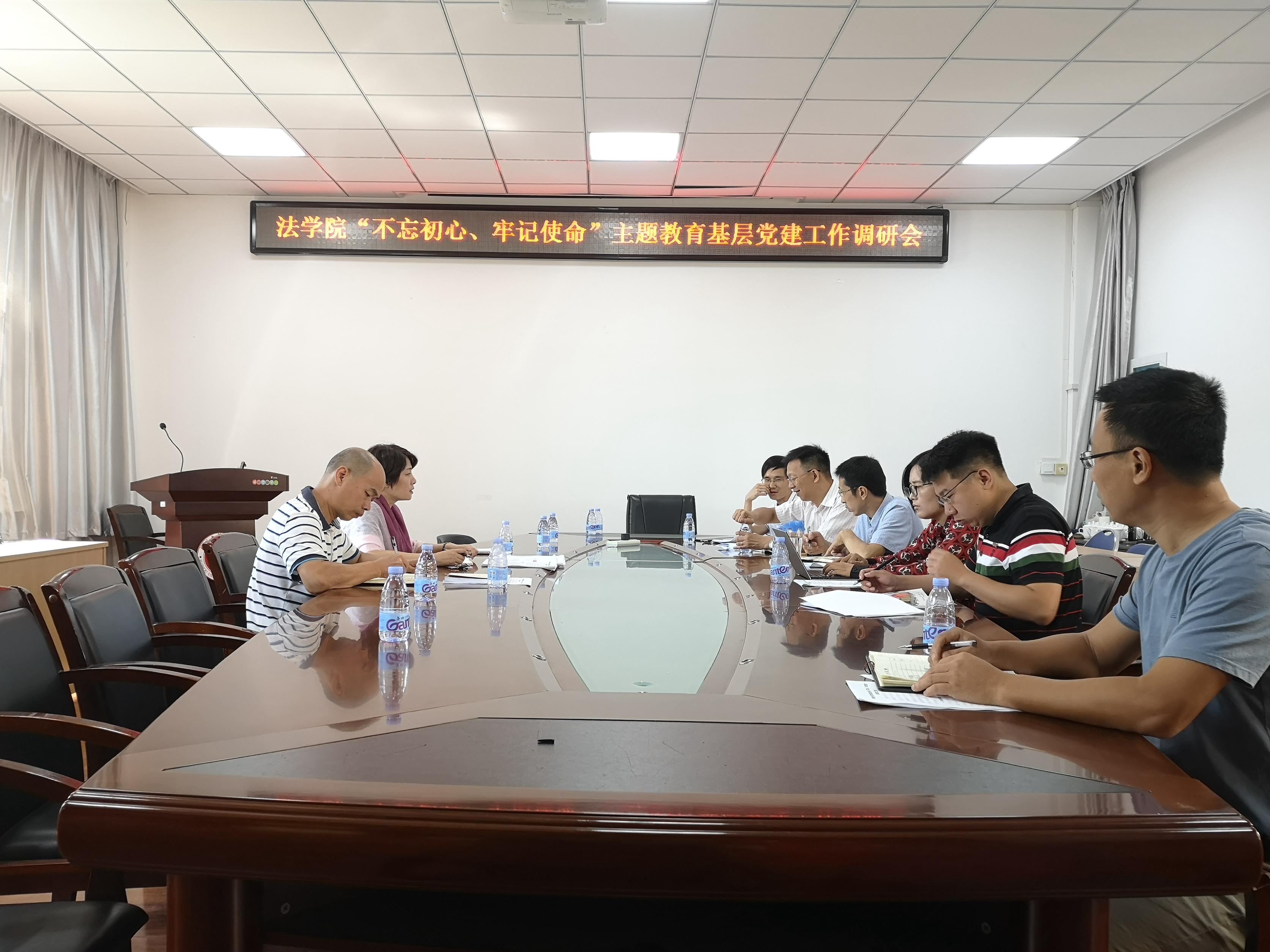新闻中心讯/9月23日,福州大学法学院“不忘初心、牢记使命”主题教育基层党建工作调研会在法学院233会议室召开,院党委张泓书记、院党委蔡剑英副书记及院党办主任、组织员、团委书记、各教工党支部书记参加了座谈会。