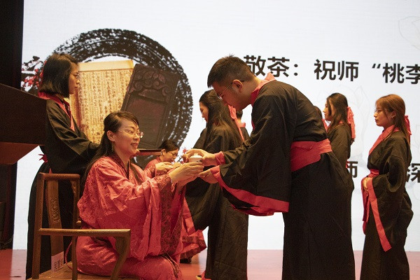 “凡学之道,必先敬师,师敬,然后道尊,道尊,然后民知敬学;故为学者必先谢先圣先师,其为敬道之本也。”汉服学子挺拔,颂词之声朗朗,在古筝声中进行的谢师礼是人文学院毕业典礼的一大特色。身着汉服的毕业学子齐至孔夫子画像前圣拜,并向老师敬茶,一敬茶,祝师“桃李满天下”,二敬茶,谢师“恩深情义重”。随后吴慧娟副院长为同学们道明毕业之训,告诫同学们在未来的生活中时刻不忘“为社会福,为邦家光”。