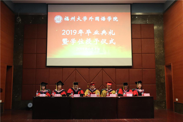 新闻中心讯/6月4日下午,外国语学院隆重举行2019年毕业典礼暨学位授予仪式,党委书记陈伟民、负责学院行政工作的副院长钟晓文教授、院党委副书记王三强、副院长林继红教授、英语系主任陈玉副教授、日语系主任金玉花副教授、德语系副主任王晓霞老师、教师代表、家长代表及2019届全体毕业生近两百人参加毕业典礼。