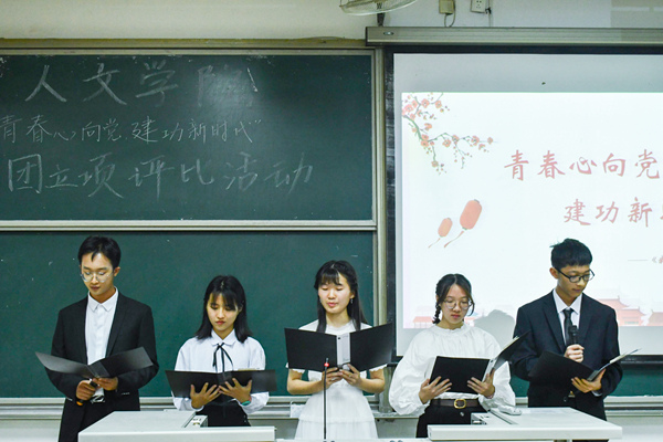 在活动中,各个班级用各具特色的方式生动地展示了班级团立项活动的风采。“高山巍峨,雄伟的山峰俯瞰历史的风狂雨落,暮色苍茫,任凭风云掠过。”17级汉语言文学团支部在展示中朗诵了现代诗《我的祖国》,以真挚的情感打动了在场的观众,赢得了老师同学们热烈的掌声。18级心理学团支部展示别出心裁,以店主招待客官的形式向在场老师和同学介绍团立项活动。此外,他们还对自己此前拍摄的视频进行了演唱,视频中她们身着红裙,舞姿曼妙,歌声优美。其他团支部也同样带来精彩的展示。经过评委老师和学生会主席团成员的统分后,18级应用心理学团支部荣获一等奖,17级社会学团支部、18级社会学团支部获得二等奖。