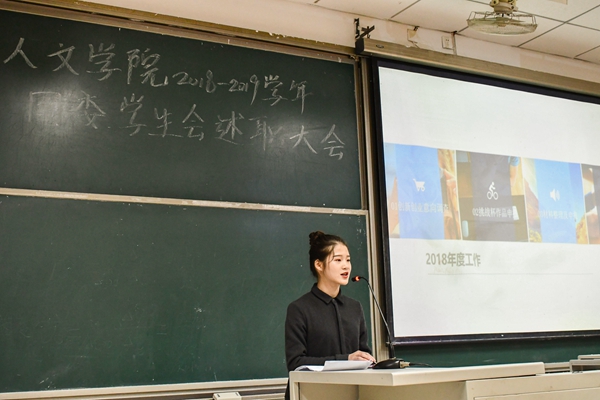 大会上,从体育部部长开始,各部部长依次对部门现状以及未来规划进行总结汇报。其中,校友联络部部长韩莉文,从走访骨干校友、成立人文学院校友会、展望未来等角度展示了校友联络部不断发展完善的过程;记者团团长何益名用各类数据展示了记者团为学院三下乡新闻工作、校运会所做的新闻工作,并对记者团的学期代理副部制度进行了介绍。而有些部门的展示颇具创意:学习部将部门比喻为“学习咖啡厅”,获得了同学们一致赞赏;视觉传媒部部长曾璐瑶化用“小媒”这一形象,有条不紊地讲述了视觉传媒部门的工作和收获。