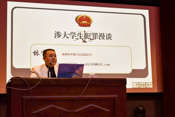 新闻中心讯/12月16日晚,人文学院于图书馆博学厅举办“明礼知法,正身扬法”法治系列讲座之涉大学生犯罪漫谈,福州市中级人民法院四级高级法官林守霖先生担任主讲人。人文学院党委郑志刚副书记、人文学院团委齐朝阳副书记出席讲座,人文学院全院学生积极参与。