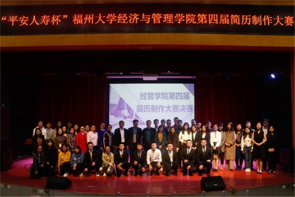 新闻中心讯/11月20日晚,经济与管理学院于图书馆明德厅举办的“平安人寿杯”第四届简历制作大赛。平安人寿福建分公司人力资源部高标经理、陈碧章主任,福州大学就业指导中心主任张志忠、黄贵闽老师,经管学院党委周强副书记,院团委赵燕松书记等领导老师担任本次大赛评委。