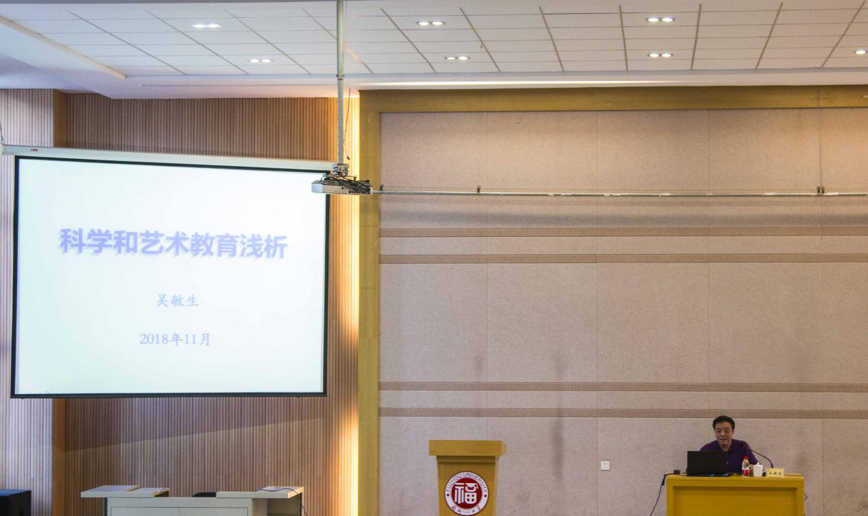 全体师生对吴敏生教授的到来表示热烈欢迎。吴敏生教授从科学与艺术创作的珠联璧合引入,展开讲座。此次讲座主要分为四个部分,即艺术与科学是文明进化的谐音,是思维的共鸣,是心智的启迪,艺术与科学呼唤科学人文精神。报告深入浅出,旁征博引,内容丰富,为参会人员阐述了“轴心时代”的文化繁荣,数与自然的和谐之美,分形与自然的和谐之美,《风赋》和“蝴蝶效应”的和谐之美,艺术与科学的自绘。让参会人员深深体会到科学与艺术教育之间千丝万缕的紧密联系。