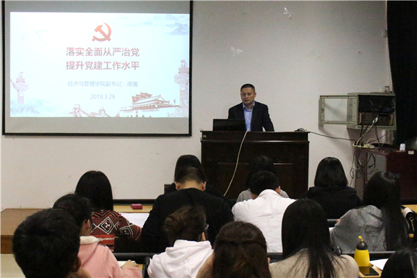新闻中心讯/3月28日下午,以“落实全面从严治党,提升党建工作水平”为主题的党课在经管北楼116举办,经济与管理学院党委周强副书记担任主讲人,院党办负责人及经济与管理学院全体辅导员参加了会议。