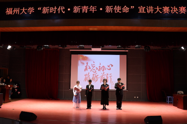 新闻中心讯/12月27日,由校团委主办的第一届“新时代,新青年,新使命”宣讲大赛决赛在图书馆博学厅成功举办。由黄书婷、孙言宏、严锦洁和许涵威四位同学组成的“和平发展队”代表人文社会科学学院顺利入围决赛,参与角逐。