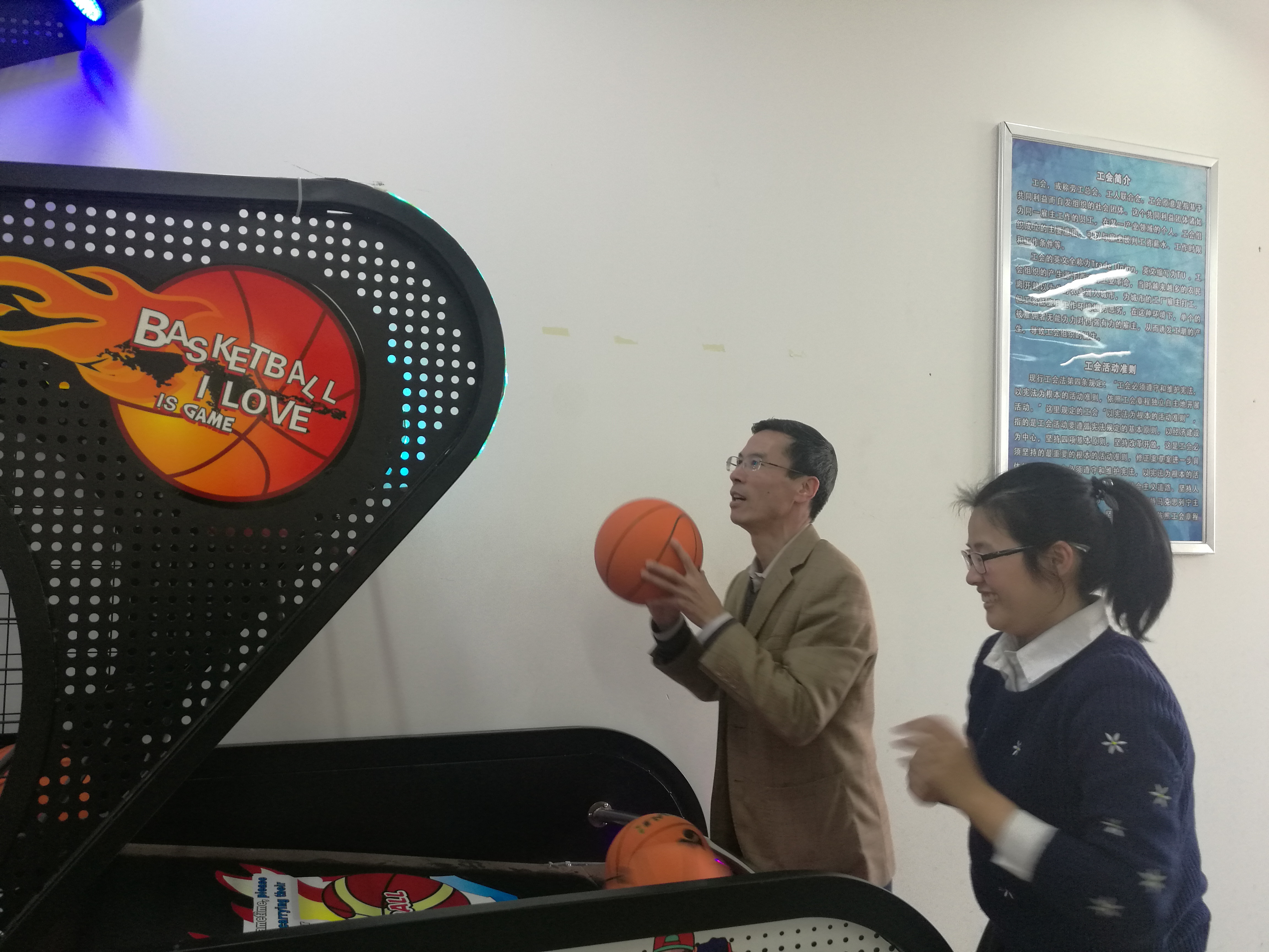 在双人投篮比赛中,每一队老师都是精神抖擞,热情洋溢,密切配合,争取最大的进球数,聚集在投篮机两旁和比赛选手后面的观战的老师不时发出喝彩声和鼓掌声。