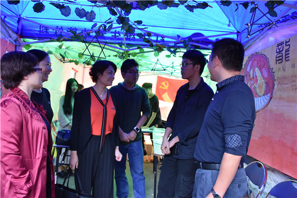 今年,法学院大本营的布置以贝克街和十九大的碰撞为创意点,体现出了法学院辩证理性及与时政热点结合的思维方式。其中,大本营布置中所体现的蓬勃向上的时代风采和运动精神获得了学院领导的一致好评。视察中,黄辉院长鼓励运动员积极备战、展现风采,并强调应保障运动员后勤补给工作的顺利完成。张泓副书记(主持工作)同运动员交流沟通,亲切询问当天参赛的教工、学生运动员比赛情况,对其表现出的高昂热情与坚定信心给予高度肯定。