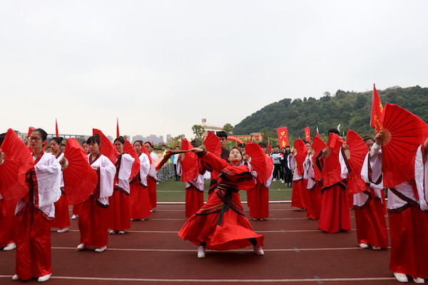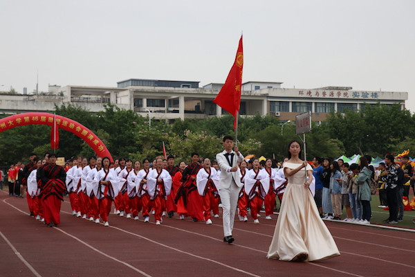 开幕会上,20支学院代表队陆续登场,各个方阵各出奇招、精彩纷呈,让开幕式俨然成为一场精彩绝伦的华丽盛宴。其中,人文学院的方阵表演匠心独具,在五花八门的方阵中脱颖而出、一展芳华:旗手曲炙、举牌员王艺霖分别着西服、纱裙,36名方阵表演人员穿传统汉服。中西合璧的服装搭配,让人耳目一新;汉式舞蹈表演韵味十足,引得在场观众驻足惊叹。在福州大学这个以工为主、理工结合的学校里,人文学子毫不示弱,在开幕式上展现了独特的人文风貌,相信人文健儿们也会在接下来的比赛中取得好成绩。