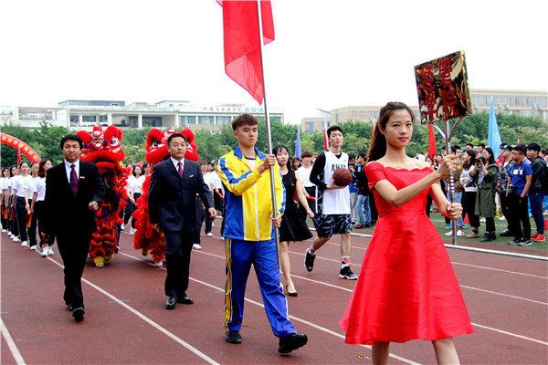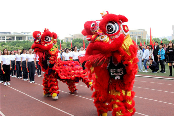 踏着秋风,各学院方阵阔步前行,依次入场。当经济与管理学院方阵入场时,一段力与美完美结合的舞狮表演吸引了全场的目光。在行进过程中,创创虎为舞狮送上了写有“中国‘互联网+’金奖”、“全国篮球赛总冠军”等代表了经济与管理学院在过去一年中在各方面取得的优异成绩的条幅,瞬间赢得了全场的掌声与欢呼。最后,手拿扇子的方阵人员将高举“贯彻十九大,决胜双一流”的方阵人员围在正中,体现了经济与管理学院学子紧跟时代步伐,为创中国梦助力的精神。“经若游龙,管似飞鸿;经管学院,辉煌无限”的口号响彻运动场!