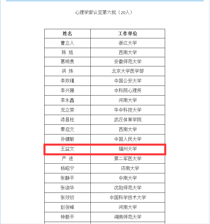 根据《中国心理学会对心理学家进行认定的决定》相关规定,经中国心理学会心理学家认定工作小组评审、常务理事会审议,我校福建省“闽江学者”特聘教授、人文社会科学学院应用心理学系王益文教授通过了中国心理学会心理学家认定,成为第六批“中国心理学家”。