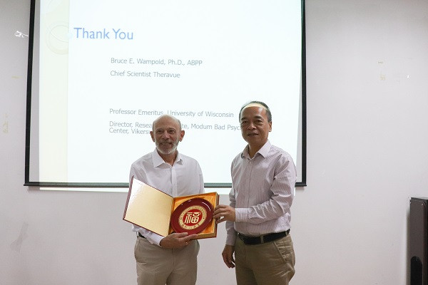 在同学们热切的期盼中,美国职业心理学委员会认证学家、挪威维克松Modum Bad精神病学研究中心主任、威斯康星大学荣誉退休教授、当今世界上最有影响力的心理咨询过程和效果研究领域的学家之一、心理治疗研究领域集大成者Bruce E Wampold博士走上了讲台。Bruce E Wampold教授以幽默的语言讲述了自己从事心理治疗研究的趣事和心路历程,通过对心理治疗模型、心理治疗关系的形成、真实关系、安慰剂、特定活动、CBT治疗抑郁症等多方面的科学讲解为在座的各位心理学专业的同学普及了前沿心理学知识。Bruce E Wampold教授以其丰富的心理学知识、严谨的科研精神以及对心理治疗的独特理解获得在场同学掌声连连。问答阶段里,Bruce E Wampold教授的认真解答更是让同学们受益匪浅。讲座尾声,人文学院党委林秋生书记代表福州大学向Bruce E Wampold教授赠送了礼物,各位同学也抓紧最后的时间向Bruce E Wampold教授请教有关心理治疗的问题并与Bruce E Wampold教授合照。