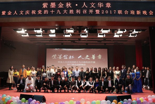 新闻中心讯/人文蔚起福大之宴,一见倾新紫金之巅。金秋月夜,紫金矿业学院、人文社会科学学院联合举办的“紫墨金秋·人文华章”——紫金人文庆祝党的十九大胜利召开暨2017联合迎新晚会于11月5日晚7点在博学厅隆重举办。人文学院党委郑志刚副书记、紫金学院党委郑寿副书记、紫金学院团委李金土书记、人文学院团委叶阁泽书记出席本次晚会。