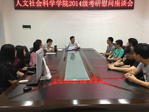 新闻中心讯/9月29日下午,人文社会科学学院2014级考研慰问座谈会在人文院办204顺利举行。人文学院党委郑志刚副书记、人文学院团委叶阁泽书记出席此次座谈会。