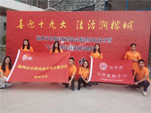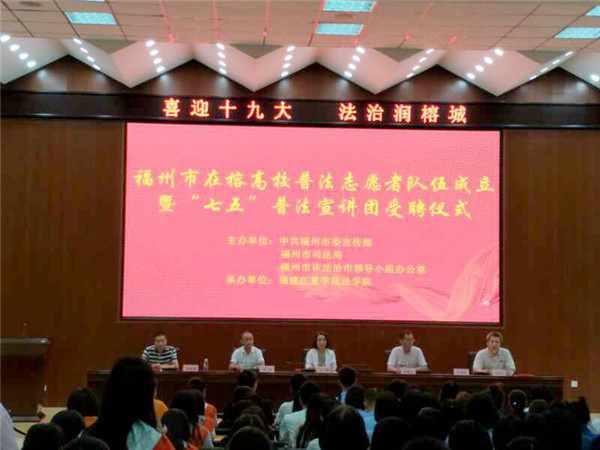 新闻中心讯/10月13日,中共福州市委宣传部、福州市司法局、市依法治市办联合举办的福州市在榕高校普法志愿者队伍成立暨“七五”普法宣讲团受聘仪式,在福建江夏学院隆重举行。福州市依法治市领导小组办公室副主任、市司法局副局长丁萍等市有关领导、福州大学、福建师范学院等10所高校的普法志愿者代表、福州市“七五”普法宣讲团代表等参加了成立仪式。福州大学法学院法律援助中心作为高校普法志愿者代表的一员,积极地参加了本次活动。